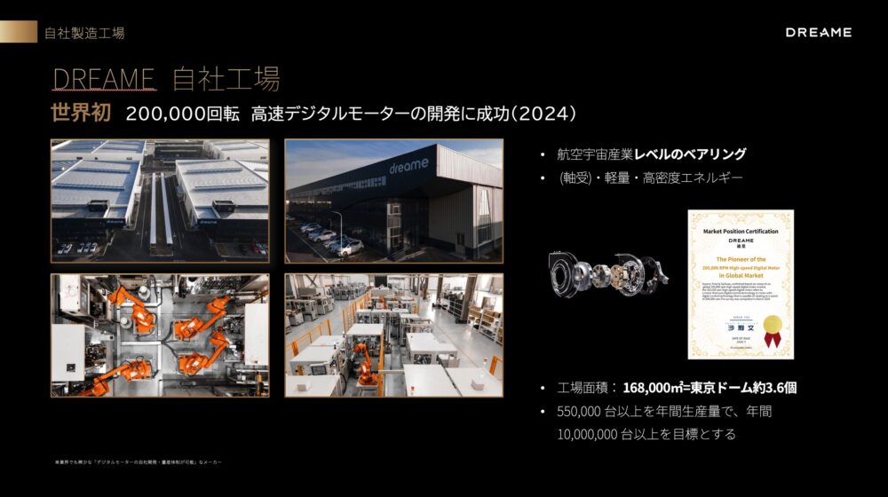 同社の歴史を簡単にひも解くと、精華大学(中国を代表する大学のひとつで、日本でいえば東京大学と東京科学大学を合わせたような学校)で2017年に航空力学研究組織としてスタート。翌年ヨーロッパ、東南アジア市場に参入。2020年には、米国市場に参入、15万RPMのブラシレスモーターを製品化し、中国では24時間稼働の完全自動化工場の操業を開始している。