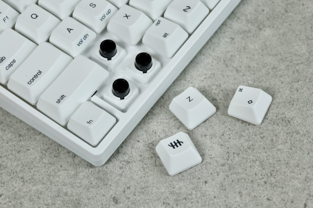 墨や雪が出た時には事務機器のようで地味……と思っていた白だが、よくみると実はツートンカラーになっていてオシャレ。また、白も中央印字になっていて、かな表記は省略されている(かな入力派の人には申し訳ないが……)。
