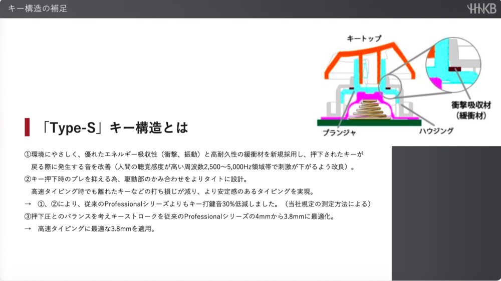 この衝撃吸収材の組み込みにともなって、プランジャーを0.3mm短くしている。両方を合わせると、非Type-Sモデルでは4mmだったストロークが3.8mmになっている。これは、当時のテストで高速タイピングには3.8mmがベストという結果が出たから。