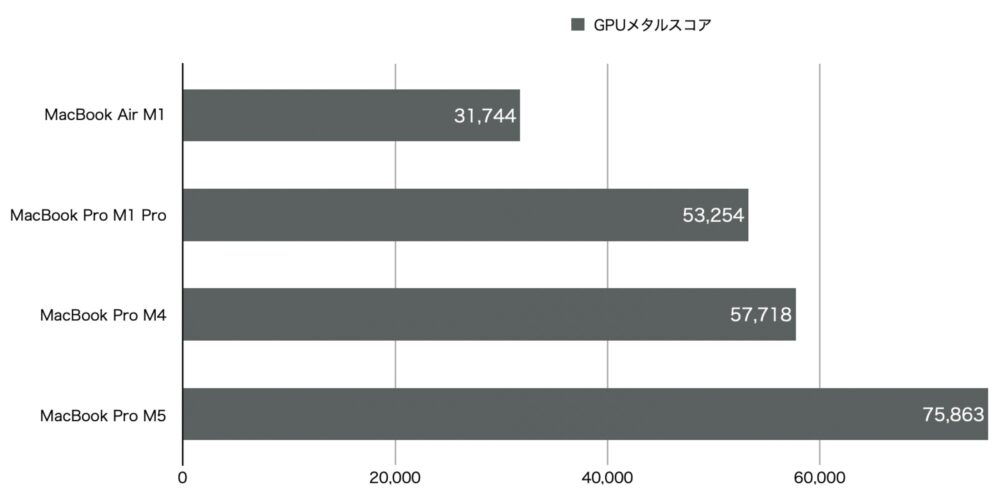 次は、グラフィック性能を大きく左右するGPUのメタルスコア。なんと、M5はM1の2.5倍のスコアをマーク。14個のGPUコアを持つM1 Proや、M4と比べても30%以上高性能だ。グラフィック性能において、大幅に性能向上したと言える。Geekbench 6のメタルの数値で約31%の性能向上ということだ。