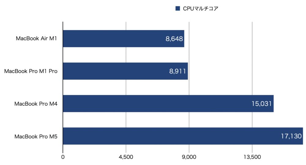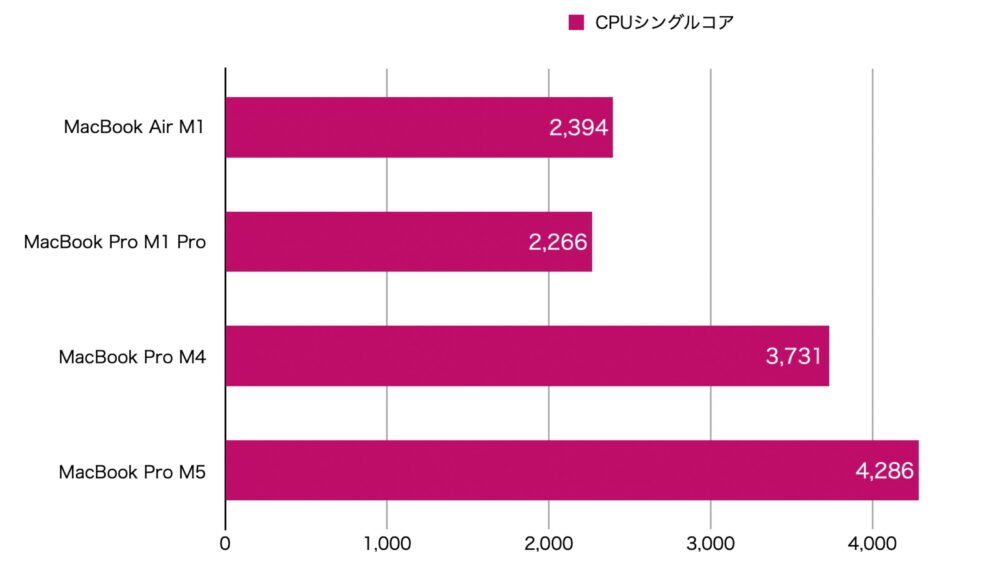 マルチコアの場合、それにコア数の差を掛け合わせたものになる。M4とM5のコア数は同じだから、マルチコアの性能差も、ほぼシングルコアの数値を反映したものになる。