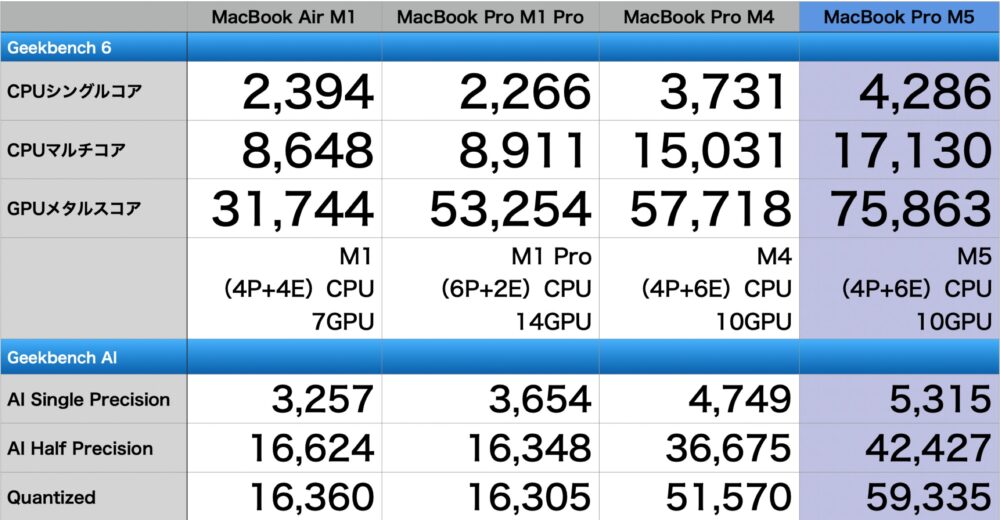 ここでは、ひとつ前のモデルであるM4、そして、参考までに2020年に発売されたApple Siliconの原点MacBook Air M1、そして上位モデルであるMacBook Pro M1 Proのデータと比較してみた。そのあたりのモデルを使っている人は、さすがにそろそろ買い替えを検討されているのではないかと思うのだ。