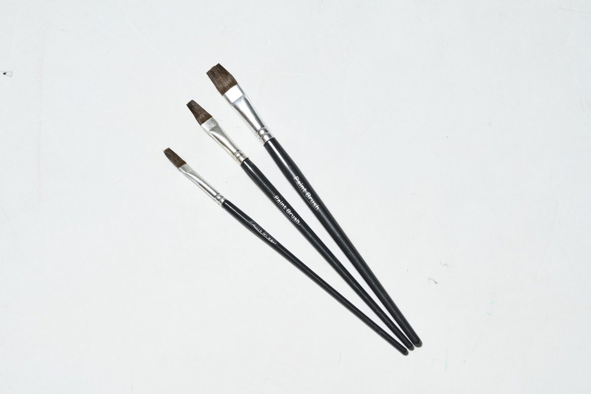 絵筆。初めは細筆から始めるのがオススメ。大きく太い筆だとペンキが飛びすぎる恐れあり。割り箸やフォークなどでも代用可能。(私物)