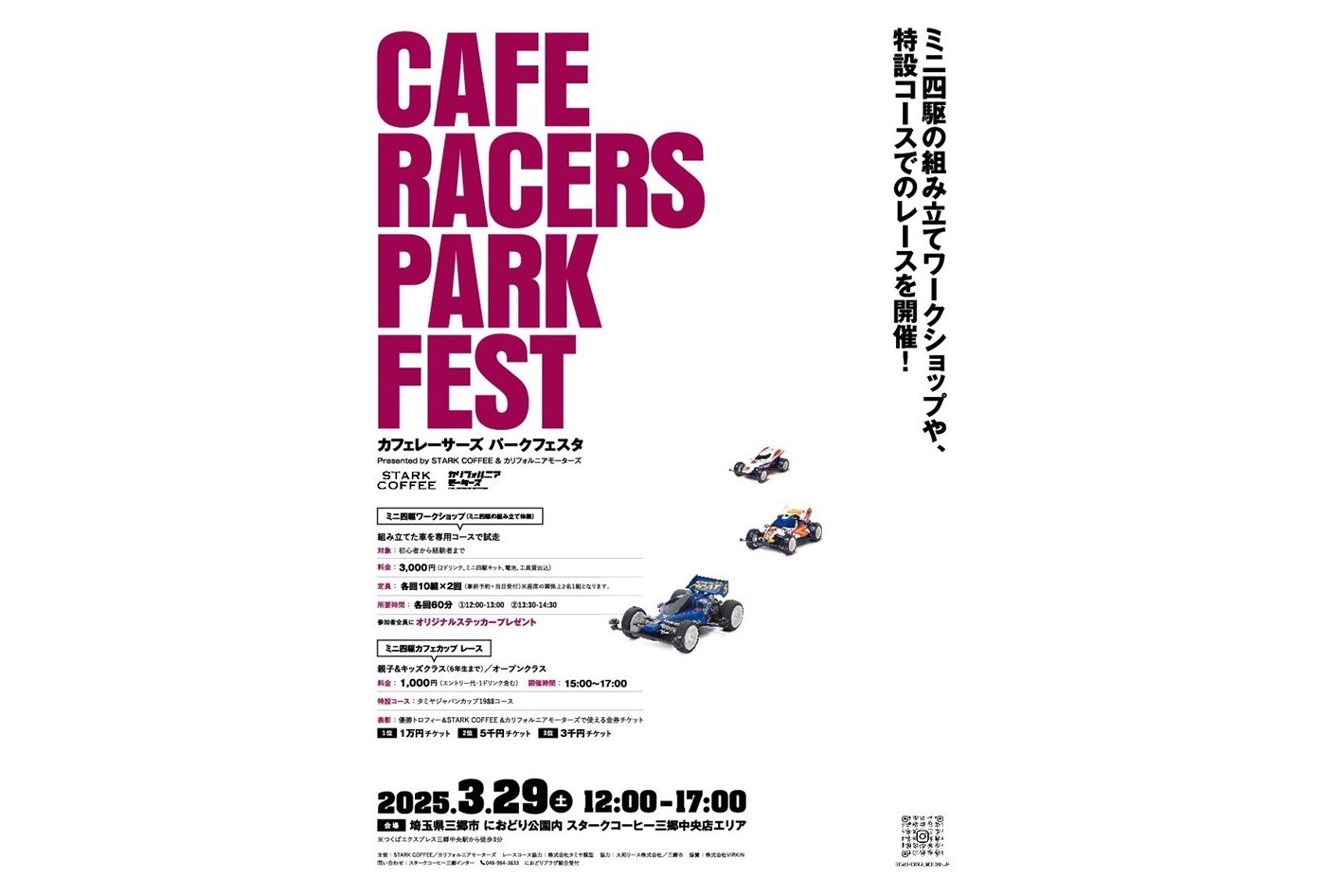 3月29日(土) 12:00〜17:00の間、カリフォルニアモーターズ主催のイベントが開催! タミヤの全面協力の元、ミニ四駆の組み立てワークショップや、豪華賞品のあたる特設コースでのレースを開催。大人は懐かしさを感じながら、子供と一緒にも楽しめるイベントとなっている。有料のワークショップ以外にも、イ...続きを読む