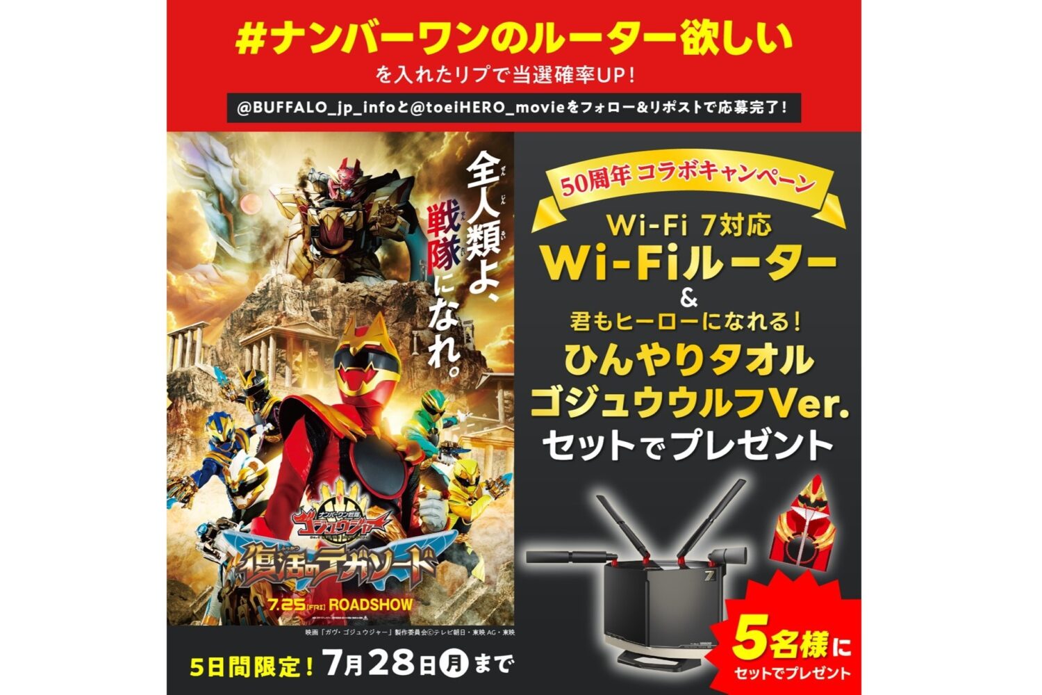 株式会社バッファロー(以下バッファロー)は、バッファローの創業50周年と東映株式会社が制作するスーパー戦隊シリーズ誕生50周年、そして映画『ナンバーワン戦隊ゴジュウジャー 復活のテガソード』の2025年7月25日(金)からの公開を記念し、Xのバッファロー公式アカウントにてプレゼントキャンペーンを開始...続きを読む