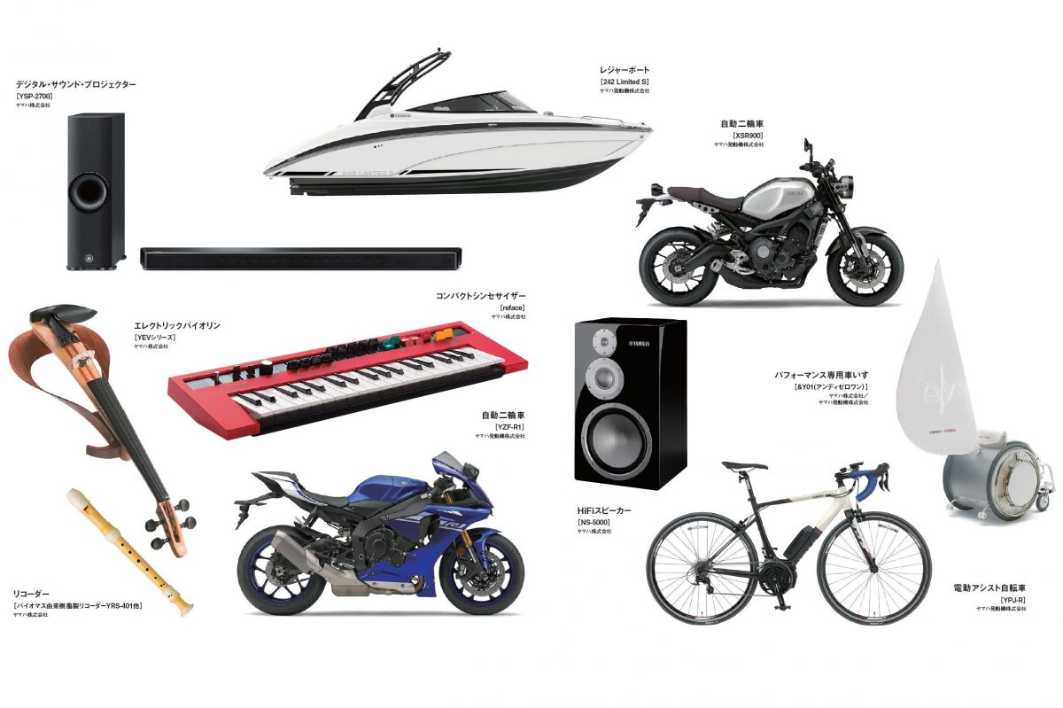 1930年代には航空機のプロペラを製造。このプロペラ製造の工作機械が戦後、いろいろなエンジンや二輪車を作る礎となった。ヤマハがこれまでに作ってきた物の一部を挙げるだけでも家具、住宅設備、船外機、ボート、プール、自動車用エンジン、産業機械、電子楽器、音響機器……とジャンルを超越し多岐に渡る。戦前、戦後、そして現代までヤマハブランドが世に送り出してきた製品は、世界の様々な分野のニーズに応えてきたのがわかる。