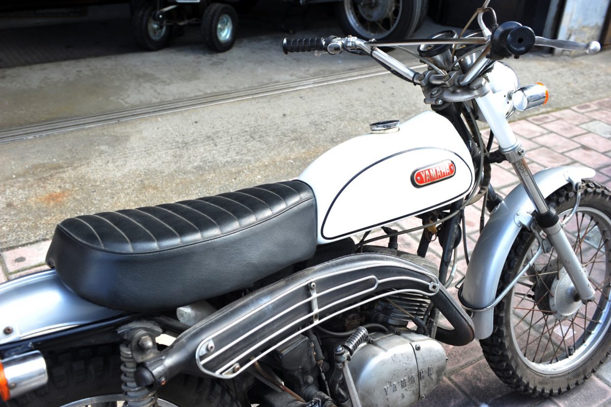 2ストロークエンジンのパワフルな走りから人気の高いDT-1の小排気量モデルAT-1。その北米モデル175ccの希少なCT-175に乗るのはアパレルショップ店員の三輪さん。「40年以上前のバイクですが、いまでも違和感無く、色褪せないデザインに惚れました」