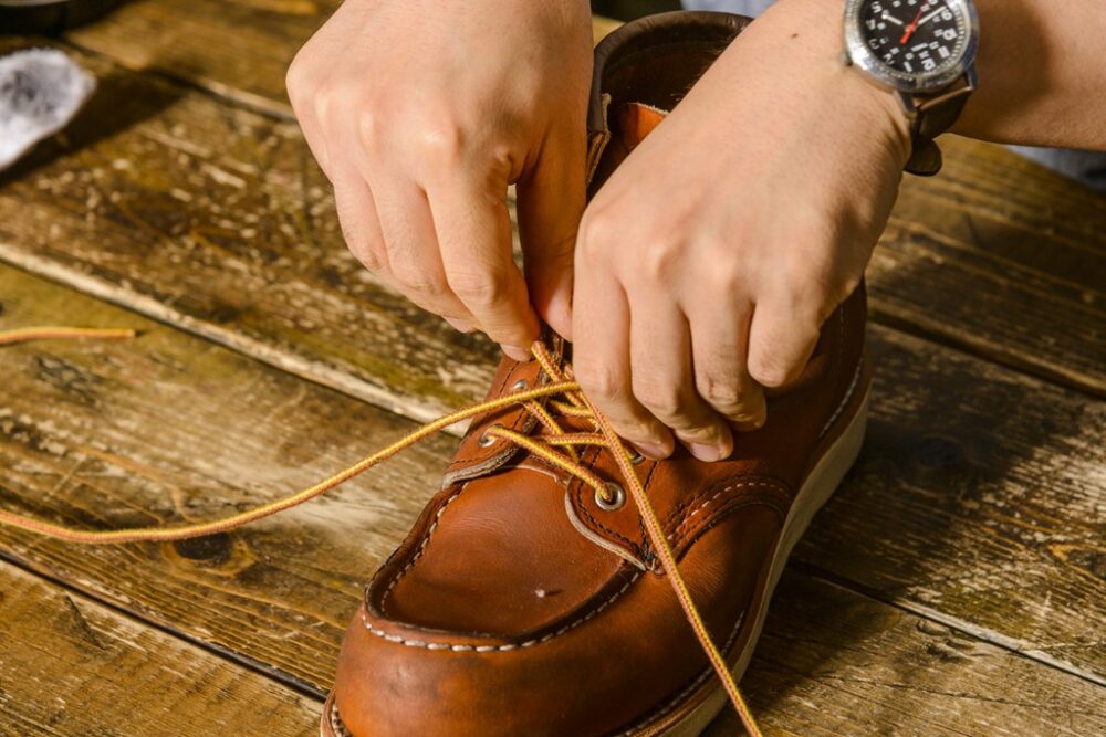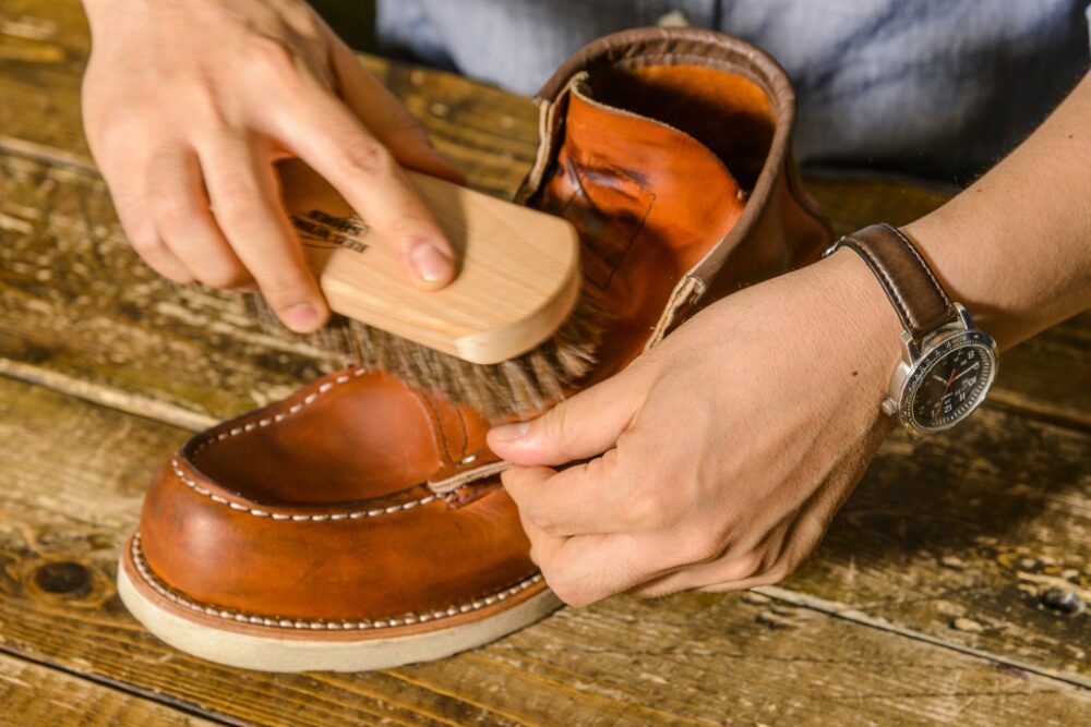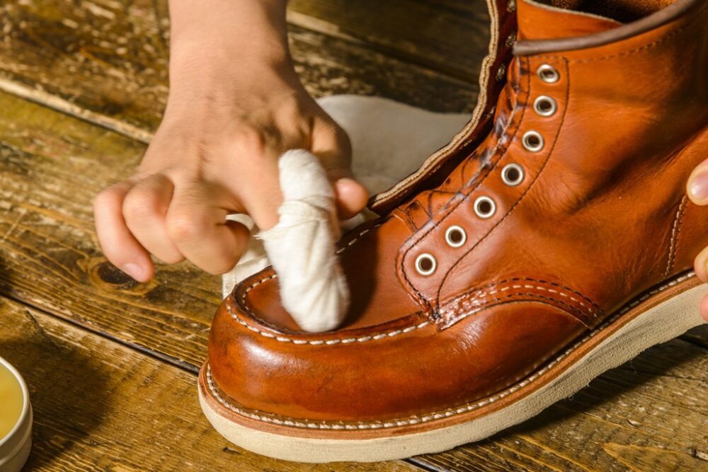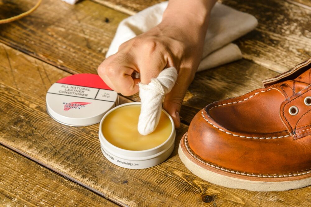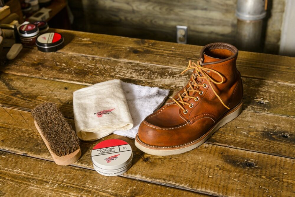 今回、お手入れするのはレッドウィングの875。オイルの入れすぎによる変色の心配が少ないで初心者でも手入れしやすい。使用するクリーム「オールナチュラル・レザーコンディショナー」は失敗が少ないので、初心者にオススメ。防水性を高めたい人はミンクオイルもあり。