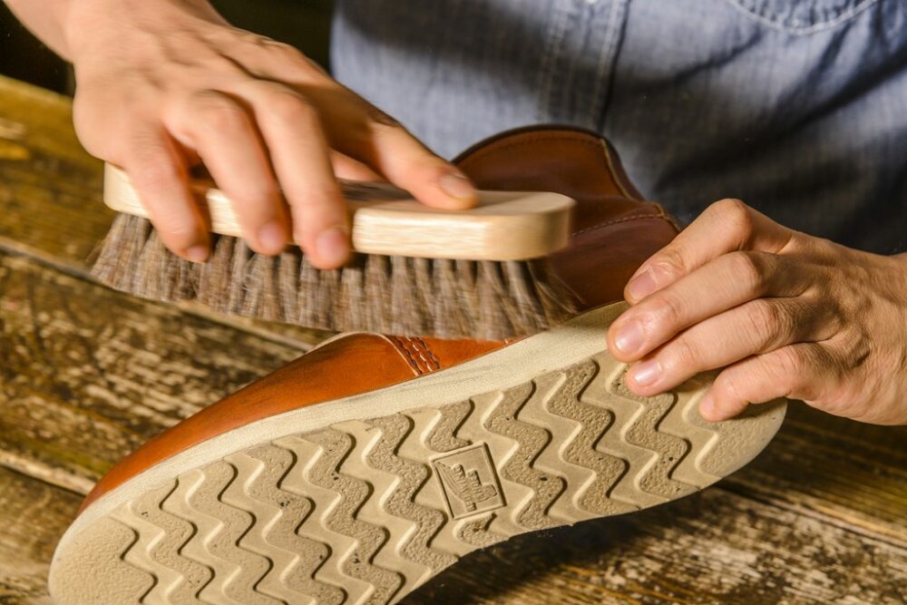 【7】シュータンや縫い目、そしてソールとアッパーの間など、塗りにくいすき間にもクロスを使ってしっかり塗り込む。