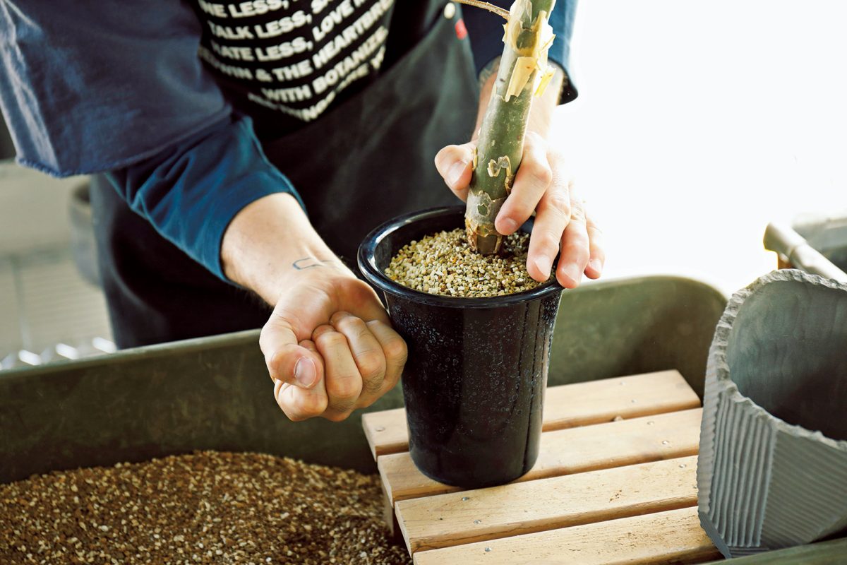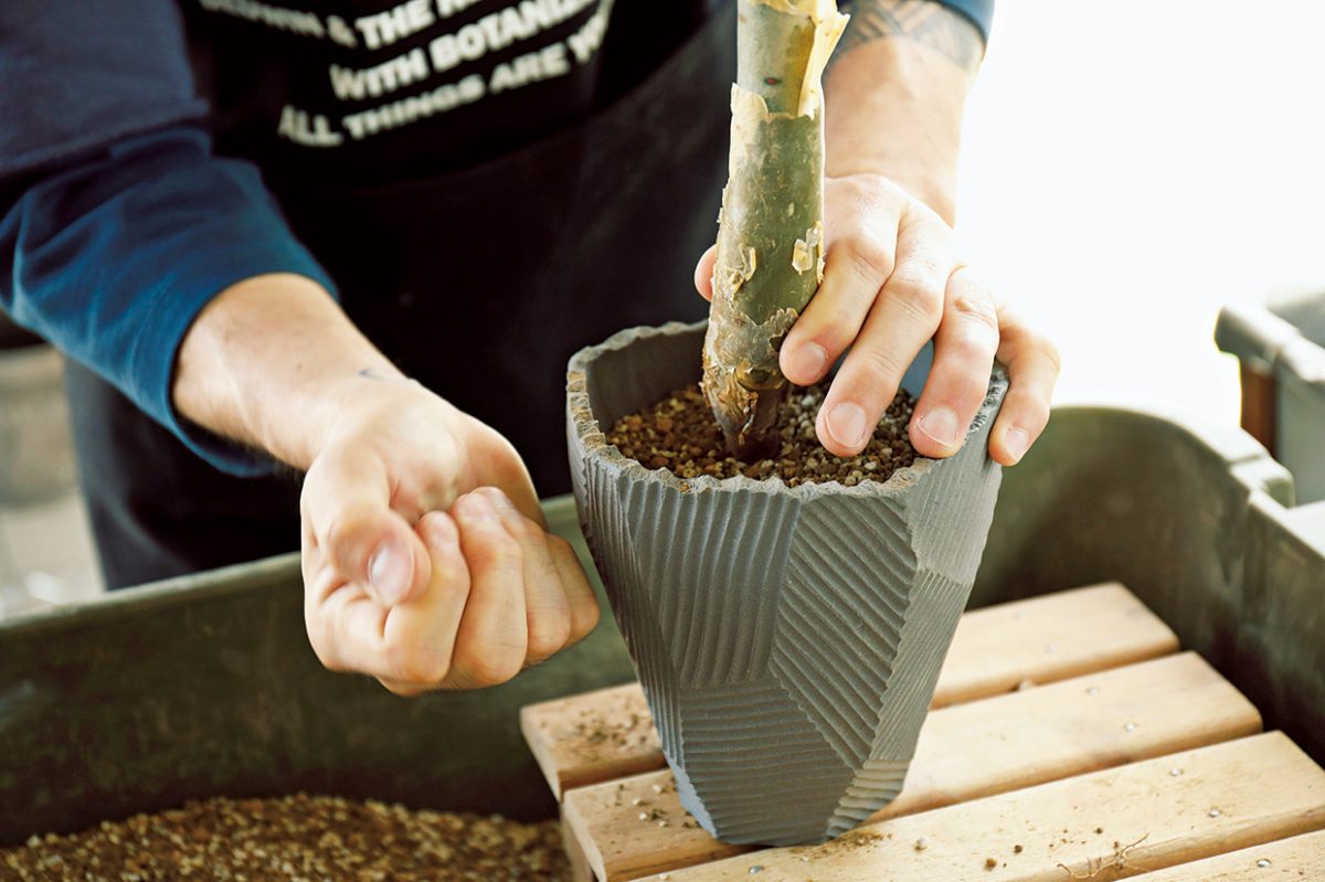 今回は、一般的なプラスチック製の鉢からクールなポットへの植え替えを実践してもらう。ちなみに高さのある植物には、程よくハイトのある鉢を合わせるのがセオリー。
