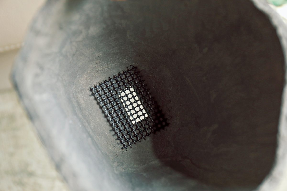 次は植え替える側ポットの準備に取り掛かる。穴のサイズにあわせて土や軽石が落ちないように園芸用のメッシュを敷く。小さな穴の場合はメッシュを置かなくてもOK。