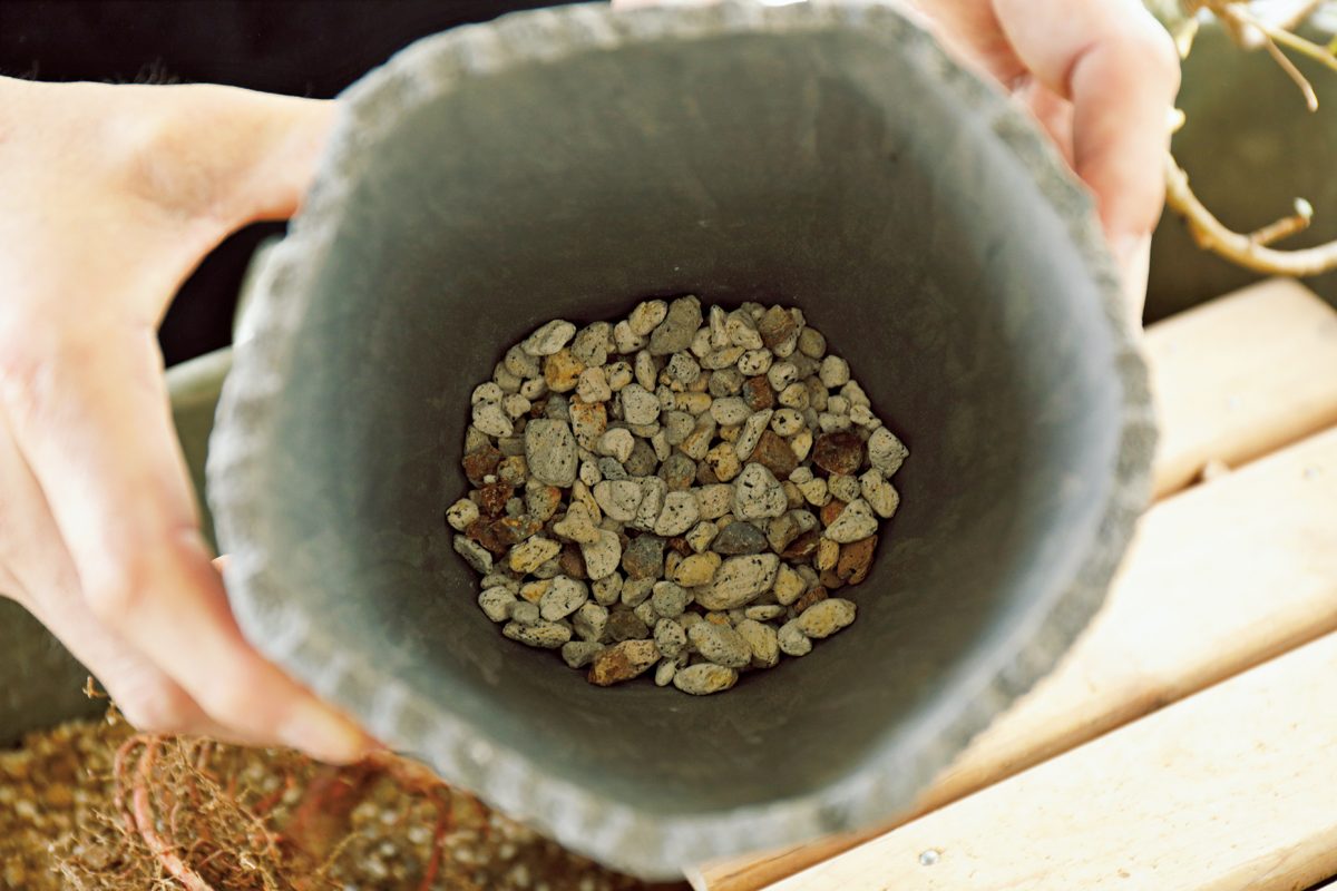 次は、鉢の水はけを良くするために小さな軽石を詰めていく。塊根植物やサボテンなどは根腐れしてしまうことも多いため、意外と大事なポイントなのだ。