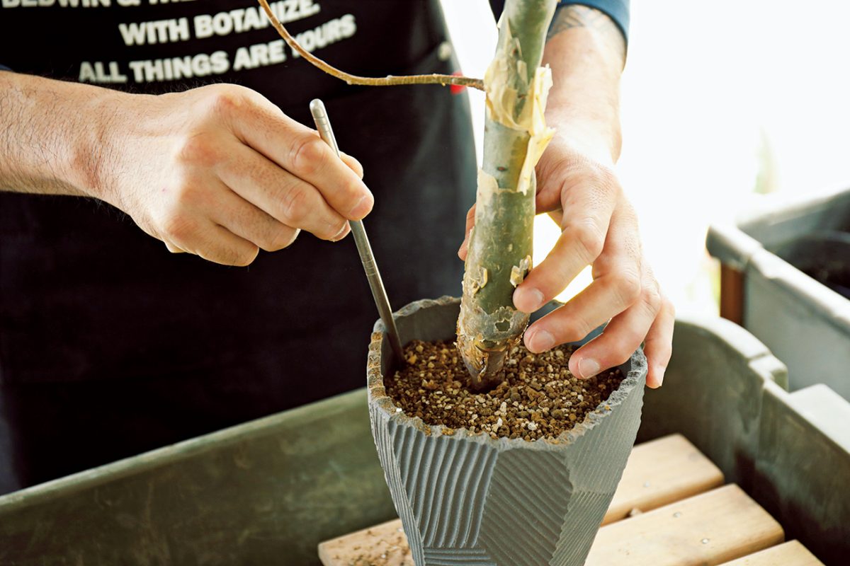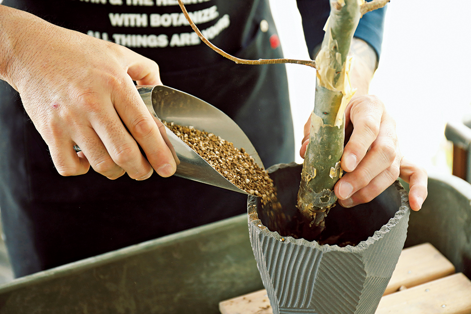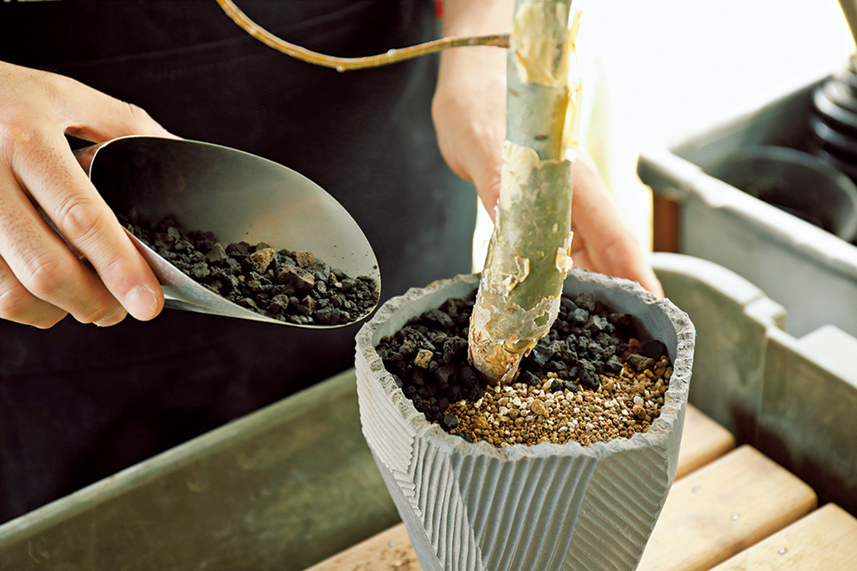 植え替える時に注意したいのが鉢の中央に植物を収めること。土を入れたら、割り箸などの棒で土の中の空気を抜いて微調整する。あまり強くかき混ぜて根を傷めないように。