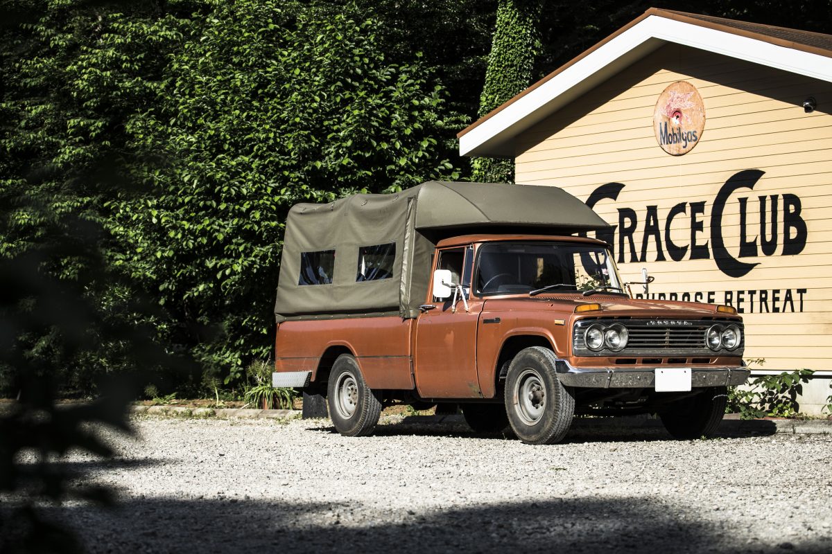 不動車だったスタウトをベースに、仕事以外の時間で約3年かけて荷台に幌を立て、自作の棚や椅子、ベッドなどを詰め込んだハンドメイドキャンパー。バイクのオフロードレースに参加する際のトランポや、遠方のキャンプにも使っていて、金額的な価値観でなく自分らしい楽しみ方を追求する高田さんのスタイルを最も表している車両と言えるだろう。「僕には豪華なキャンパーは似合わない。レースに行く時はバイクも積めるし、キャンプでも必要なモノは揃っている。田舎者のオヤジがくつろぐにはこれくらいがちょうどイイんです」
