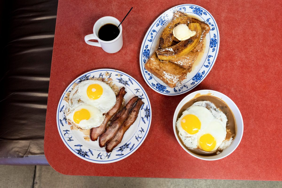 ローカル感たっぷりの店内で食べたいのが定番のロコモコ($9.55)と名物のバナナフレンチトースト($8.75)。旧きよきアメリカンレストランの空気を味わいながら食べるローカル飯は格別の味わいだ。