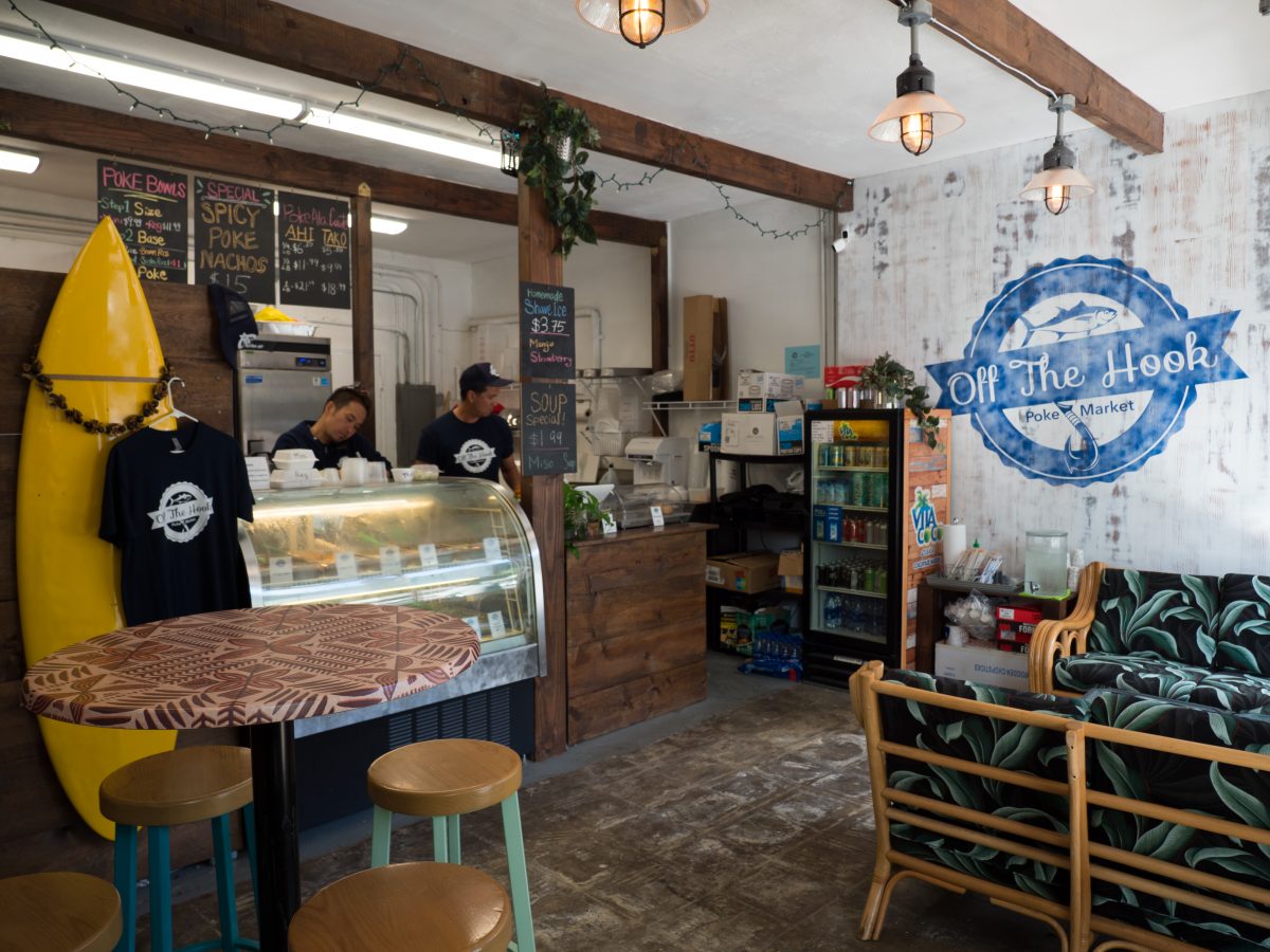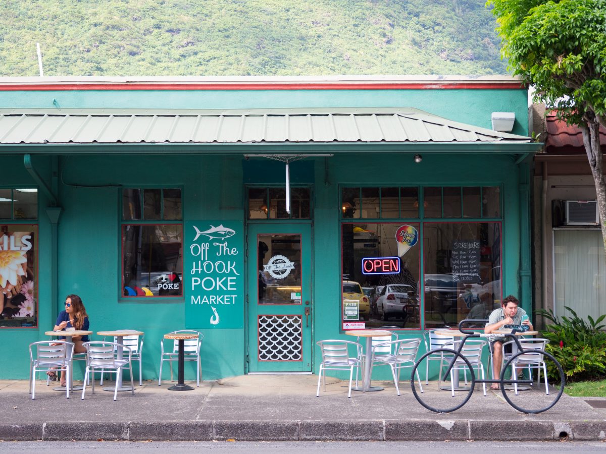 オアフ島の中心であるワイキキからクルマで約15分。ハワイ大学のある緑豊かな山中にある住宅地・マノアにある『オフ・ザ・フック・ポケ・マーケット』はローカルフード「ポケボウル」の店。