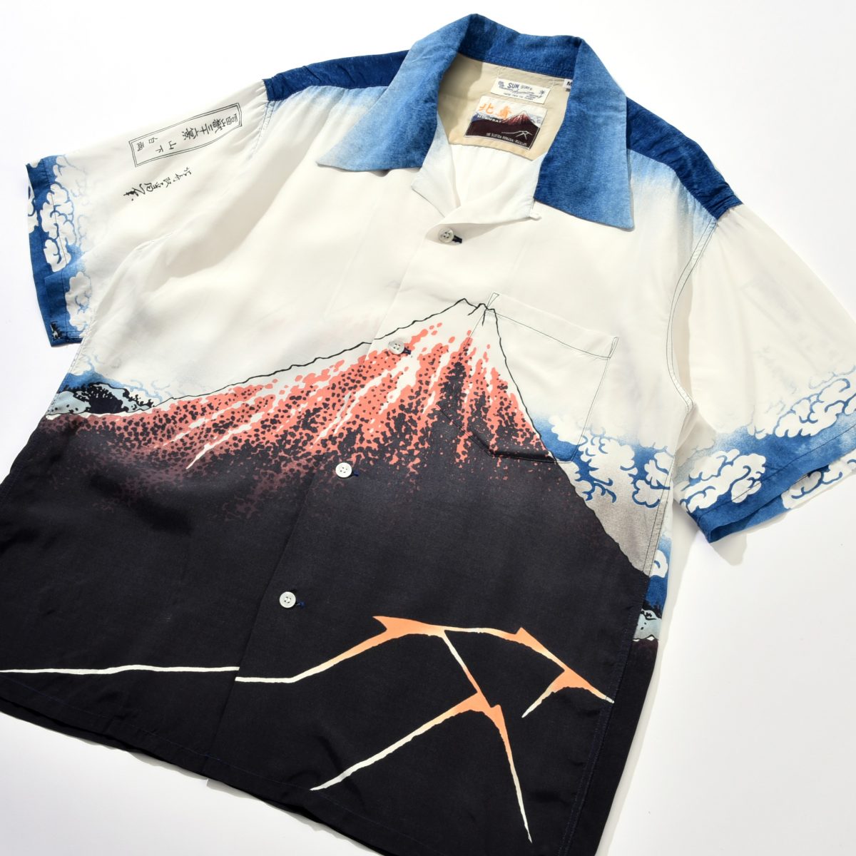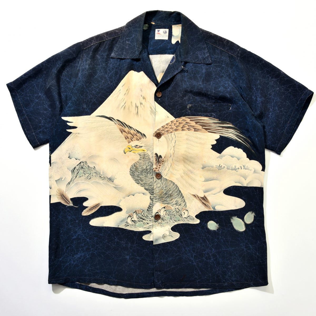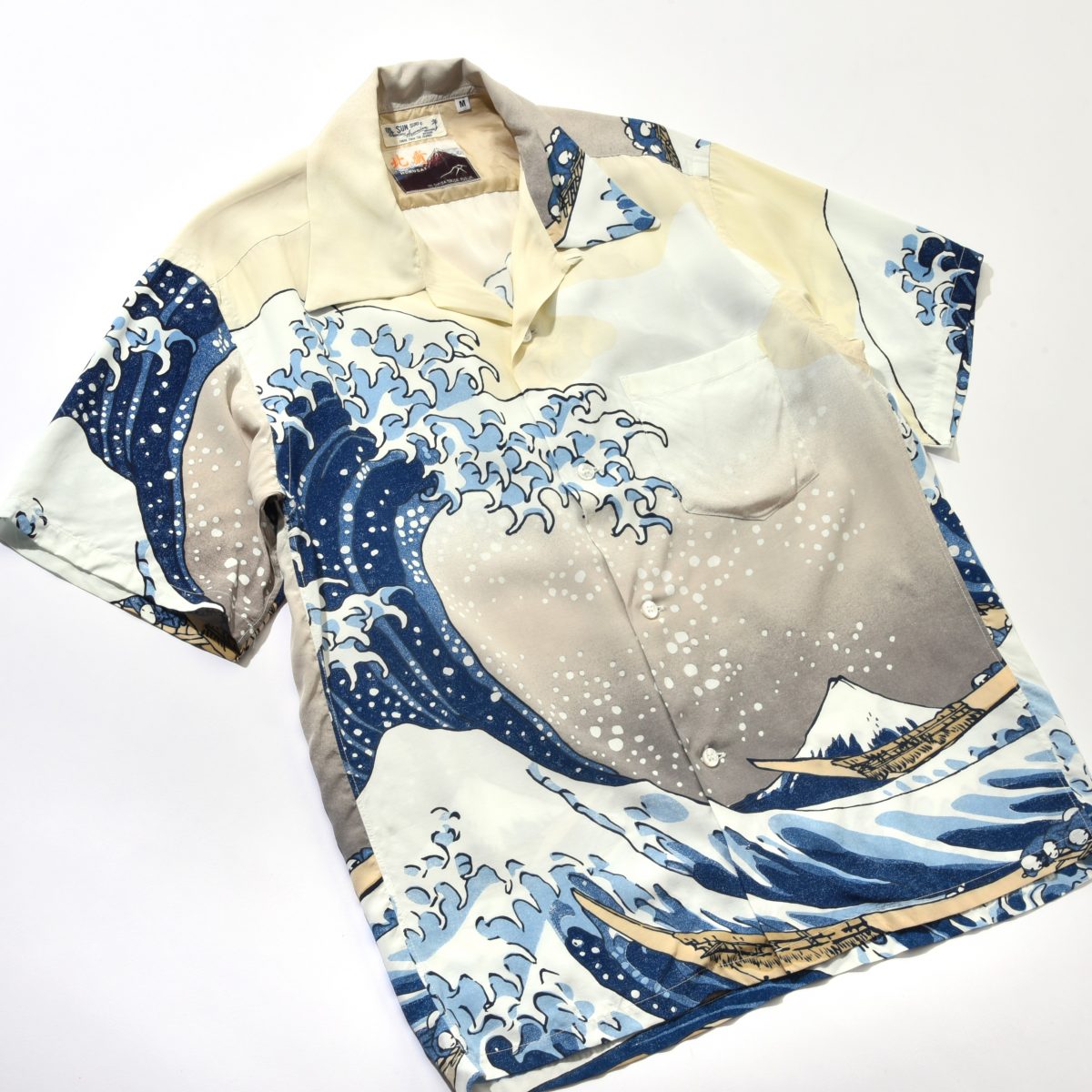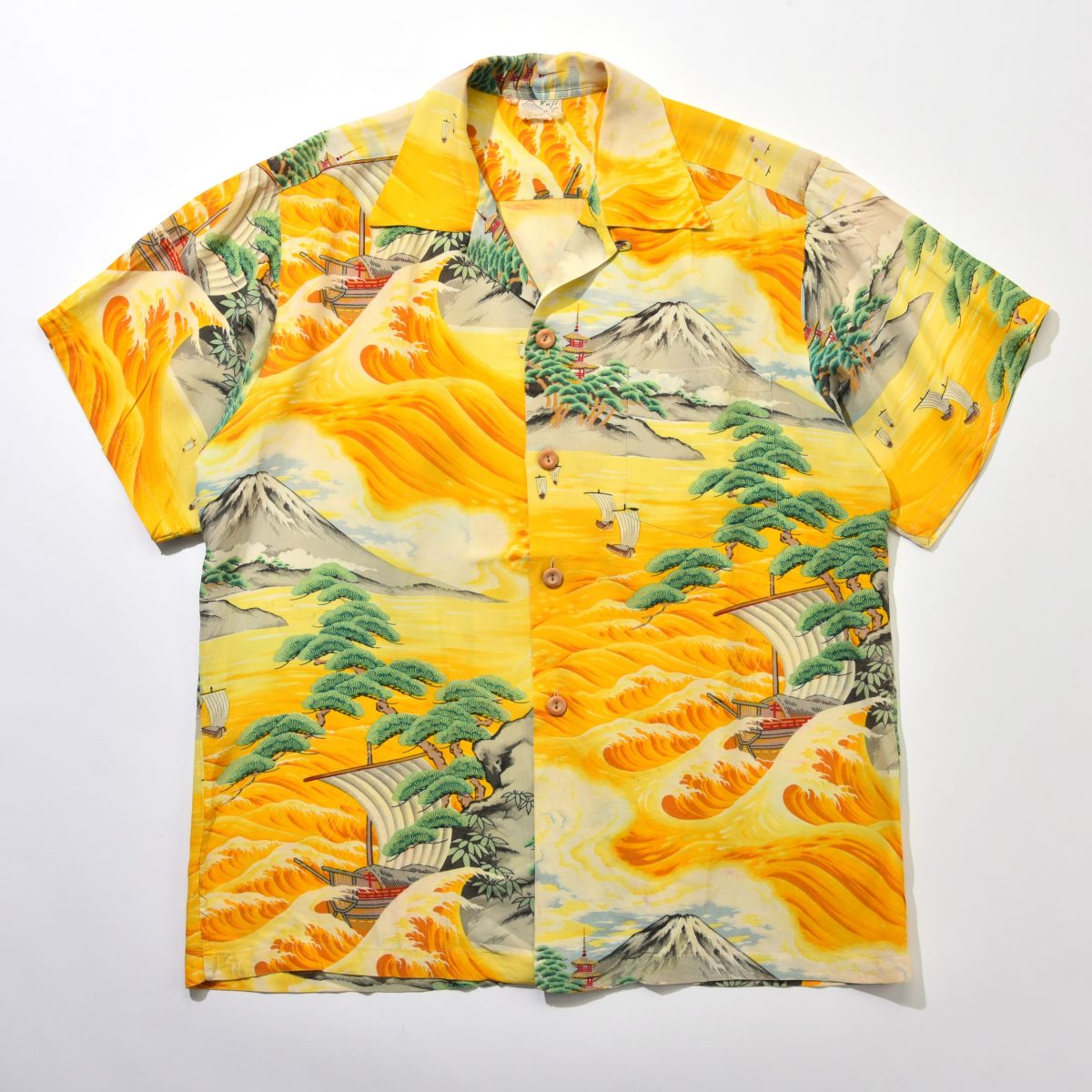 こちらは1950年代前期頃のヴィンテージアロハシャツ。日本からハワイに生地を輸入し、オリジナルのアロハシャツも手がけた『S.HATA SHOTEN』によるもの。北斎が描いた富嶽(富士山)の浮世絵の影響を見て取れる逸品である。