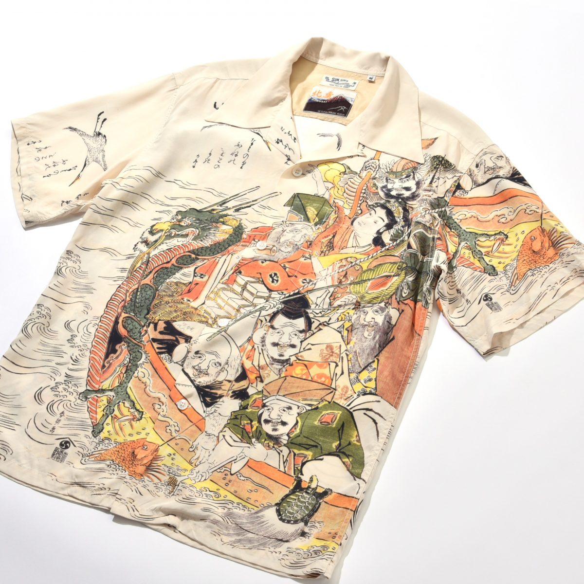 北斎が30歳前後の「勝川春郎」と名乗っていた時代の作品。当時、宝船の絵を枕の下に敷いて寝ると良い初夢が見られるというので、正月用に作られた吉祥この上ない開運美術画である。七福神に加えて鶴・亀・鯛と縁起尽く しの図柄を、アロハシャツ全面に落とし込んだ逸品。また供えられた和歌は 「なかきよの とをのねふりのみなめさめ なみのりふねの をとのよきかな」(長き夜の 遠の眠りの皆目覚め 波乗り船の 音の良きかな)と反対から読んでも同じになる回文となっており、 吉祥とユーモアが隠されている。2万7000円(サンサーフ/東洋エンタープライズ)