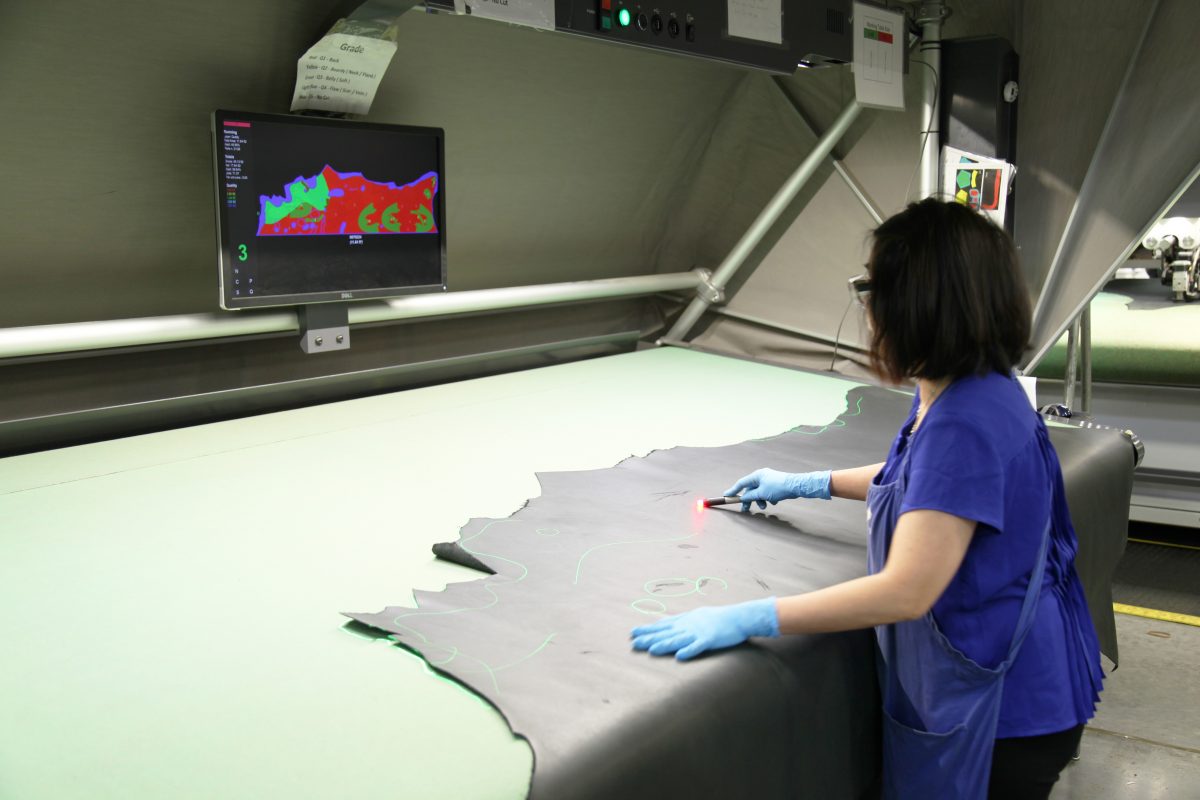人の目では探しきれない細かい傷や厚みは最新機器を駆使してさらにチェック。各パーツを裁断するためのアウトラインをこれで決めていく。