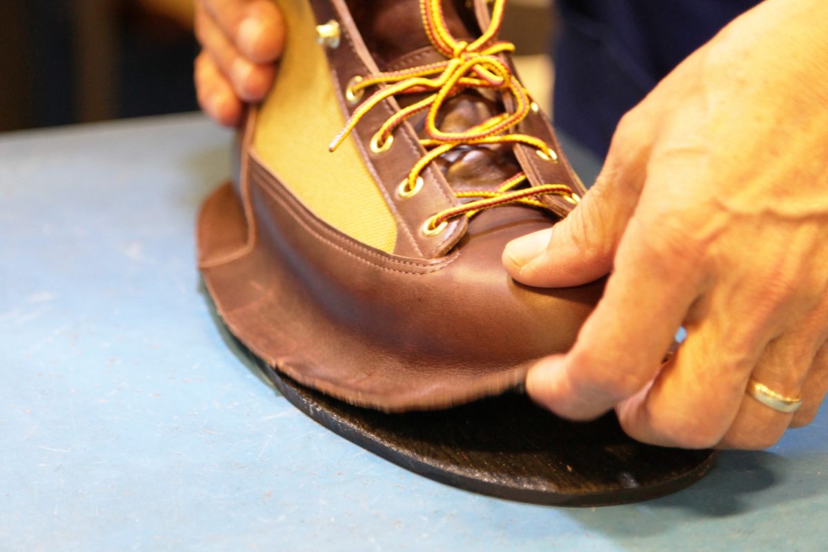 表地のコーデュラナイロンとカウハイドレザーを手際よく縫製。ダナーライトの特徴であるゴアテックスのブーティはここで装着される。