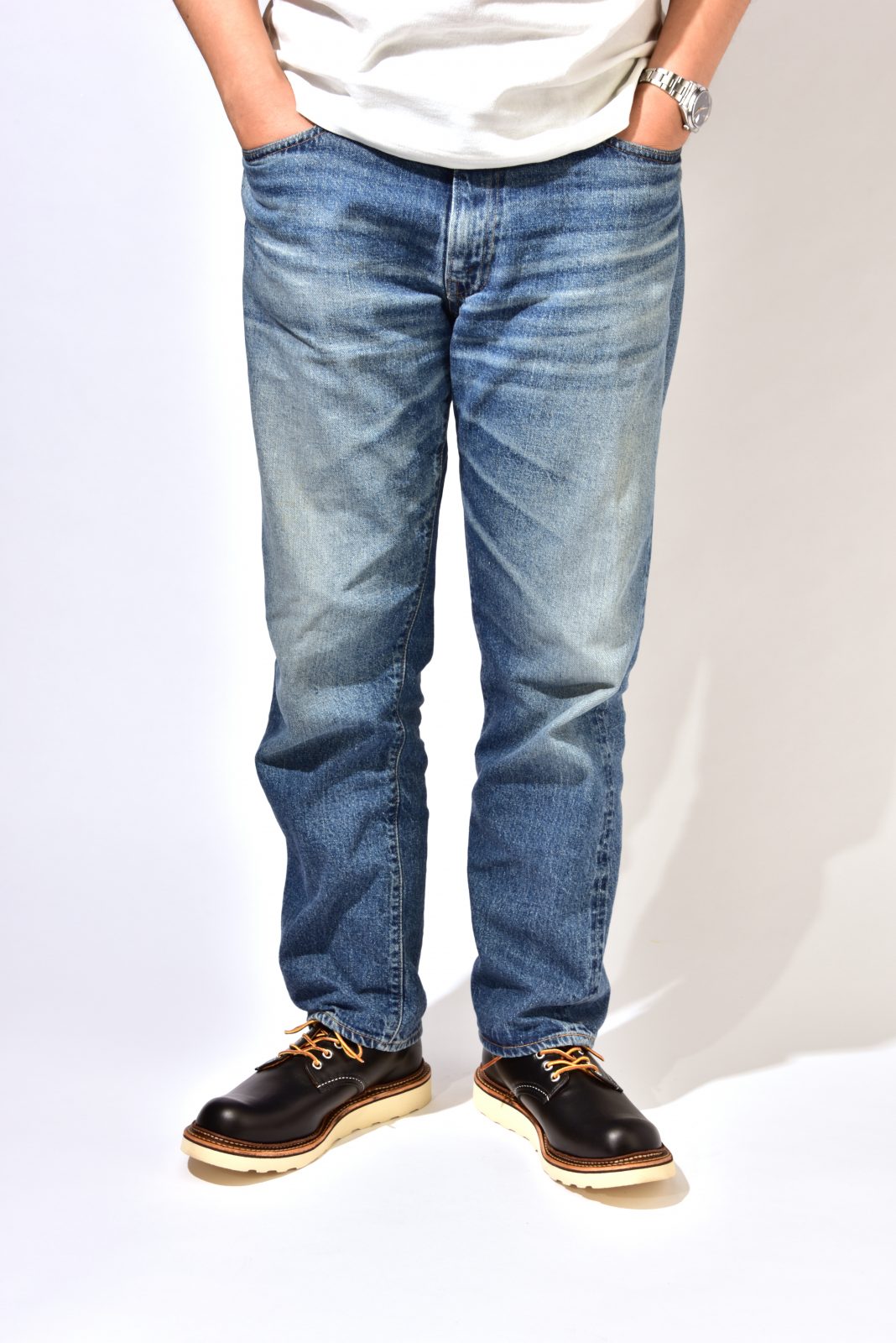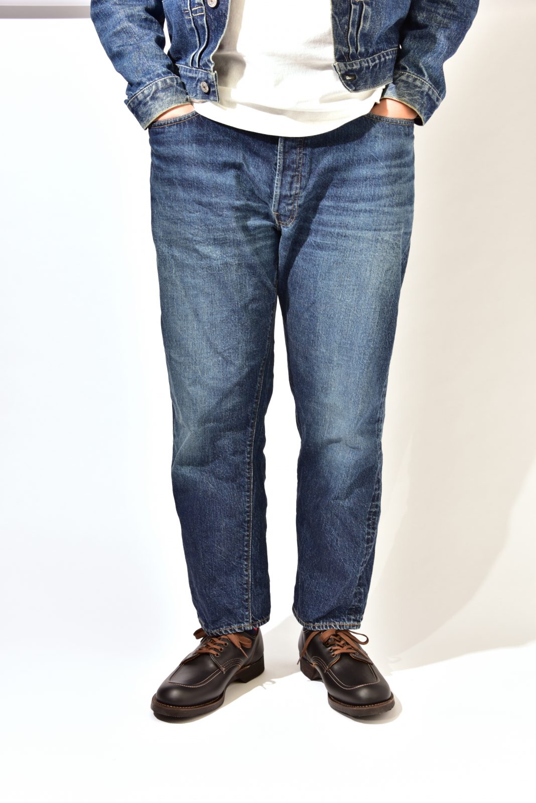 そんな1930s SPORT OXFORDには、やや濃いめ&太めのデニムを合わせてちょっぴり上品に! 茶芯のレザーなので経年変化にも期待。