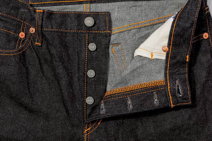 オリジナルのブランドロゴが入った鉄製ボタンを備えたフロントフライ。
