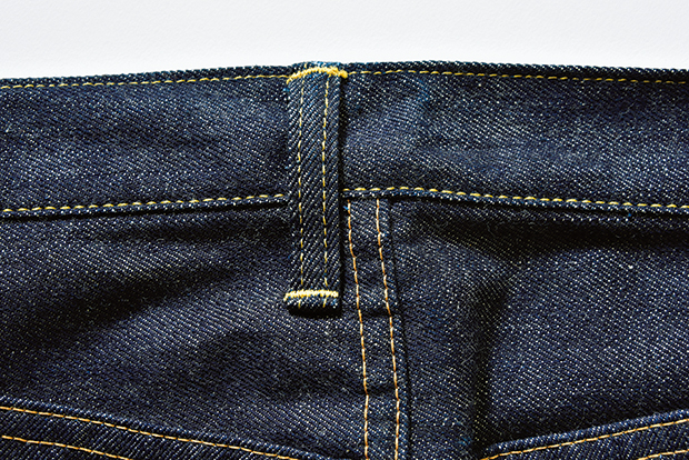 オフセットされたベルトループ。中心が自然に膨らんでいるため、凸部分から色落ちしていく。