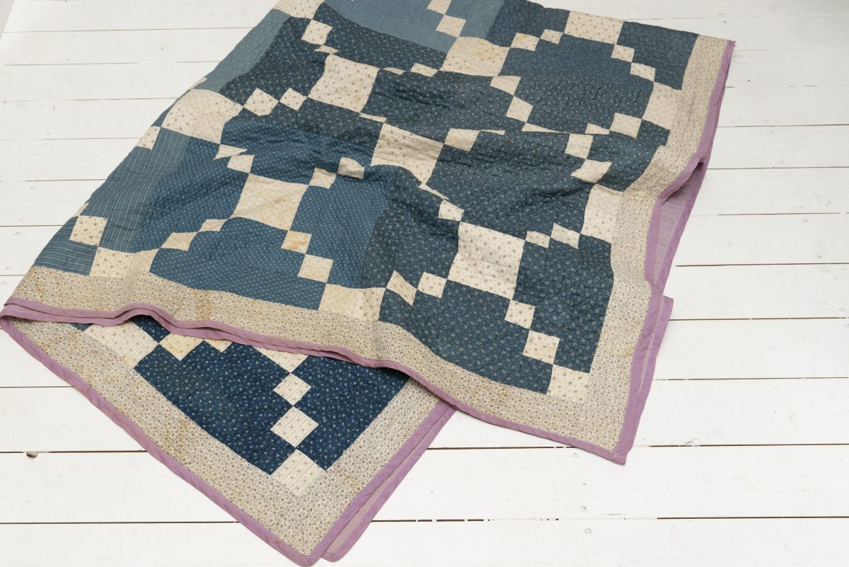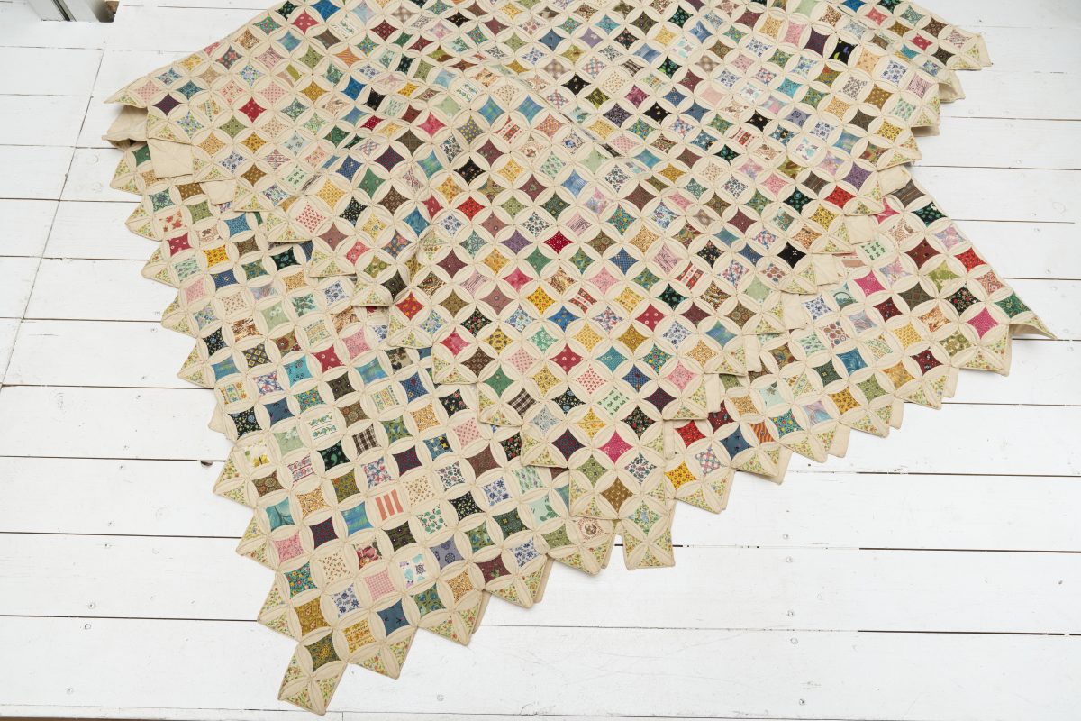 1990年代にアメリカのフリーマーケットでとある家族から譲り受けた「カテドラル・ウインドウ」という柄のパッチワークキルト。非常にきめ細やかな作りで柄がひとつひとつの異なっている。参考商品