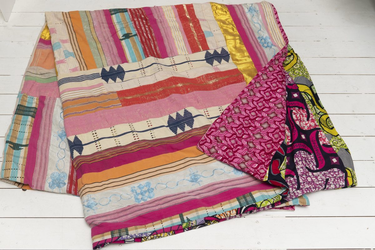 ドーサというブランドが手がけたベットカバー。アフリカ・ナイジェリアのヨルバ族が重要な行事に身につける、格式の高い礼装であるアショケを素材として使用。43万2000円
