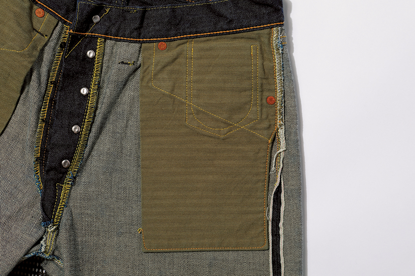 第二次世界大戦時の1942 〜’46 年、アメリカ国内で行われた物資統制下で作られたヴィンテージデニムのレプリカ。シンチバックやコインポケット口のリベット、サスベンダーボタンなどの省略、ボタンやリベットはスチール製を採用するなど当時の仕様を再現した。