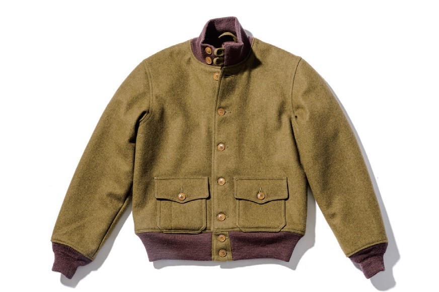 1927 年に米軍が初めて採用したフライトジャケットであるA-1。特徴はリブのスタンドカラーとフロントがボタン留めであること。フラップポケットは後のA-2に引き継がれた。こちらはウィリアムギブソンコレクションのA-1 で、素材をレザーからウールにアレンジ。