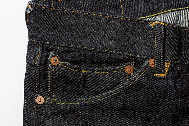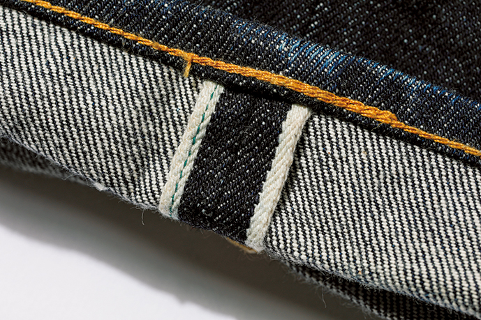 細幅の二本針縫製で仕上げた5ポケットデニムの最新作。シルエットはスタンダードなスリムテーパードだが、特徴的なパックポケットの飾りステッチやV字に斜め付けされたベルトループ、グリーンのセルビッジなど、ディテールのデザイン性の高さが光る。