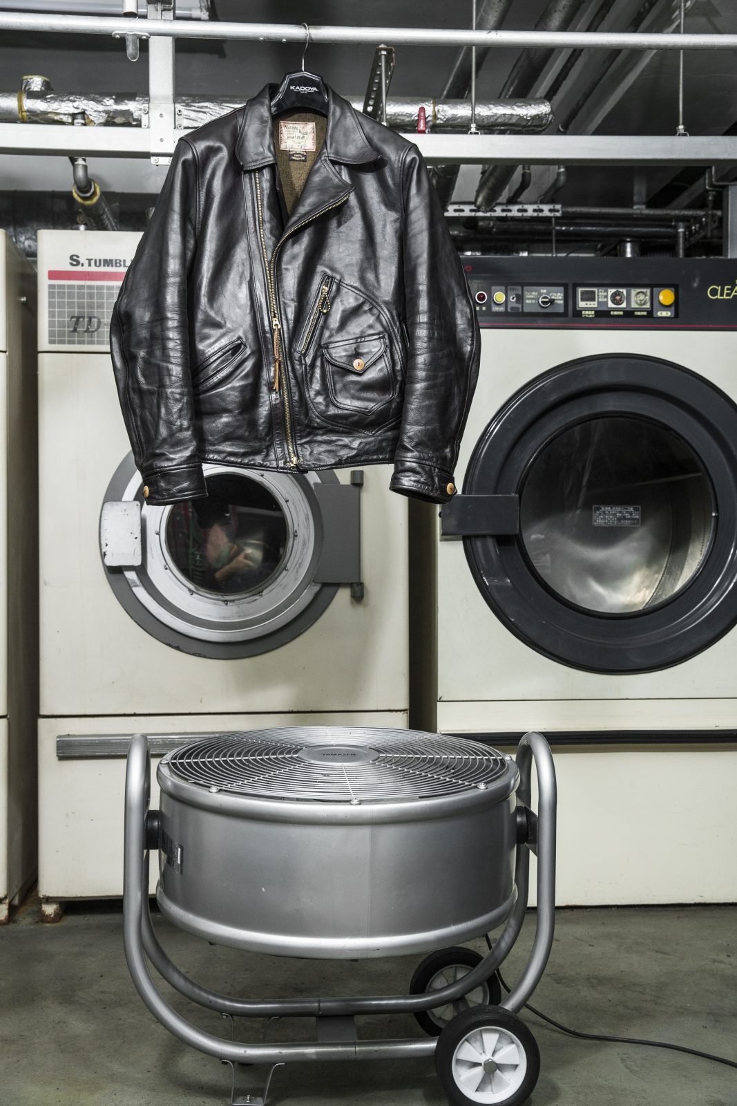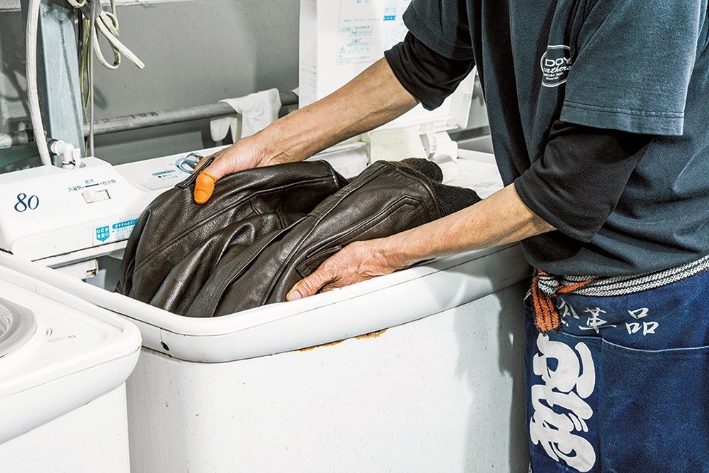 専用の溶剤が溶かされた洗濯機の中にレザーを投入。何度も試行錯誤を繰り返して編み出したオリジナルレシピを使っているので安心だ。