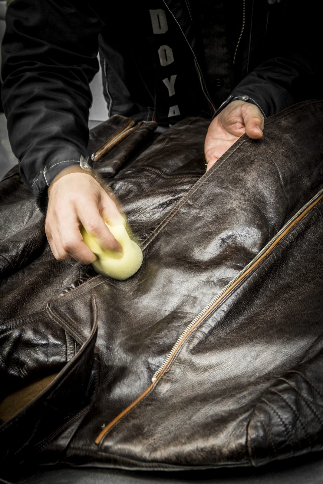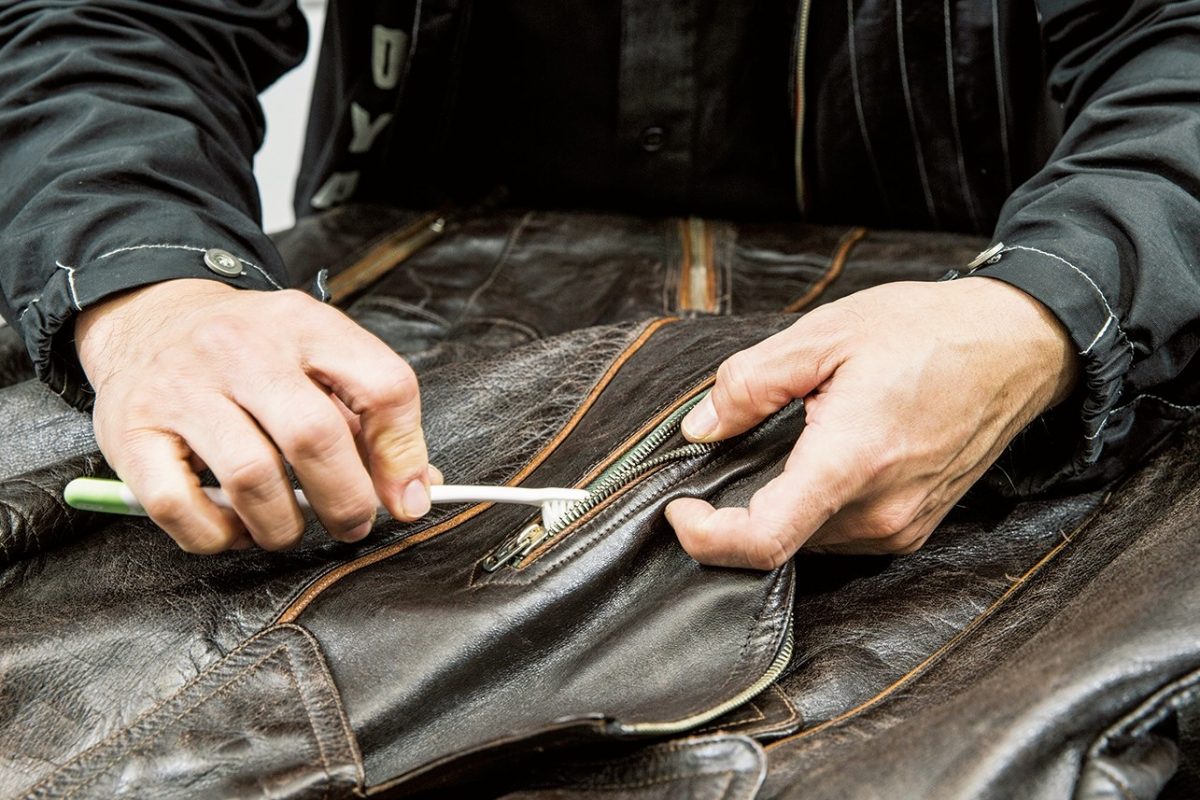 突然の雨でジャケットがびしょ濡れに……そんな時は焦らずにまずは水分をタオルで拭き取り、陰干しして乾かしていく。乾燥機やドライヤーは厳禁。ポイントは、完全に乾ききる前に、全体に万遍なくオイルを入れてあげること。これを忘れると革がパリパリになってしまうぞ。