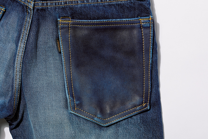 天然藍染された後ろポケット。穿きこむほどエイジングを味わえる。