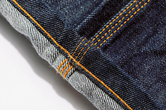 アウトシームはじめ縫製部はワークウエアに見られる3本針の巻き縫い仕様。