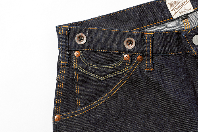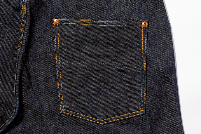 バックポケットはワンステッチのみ。カンヌキ部にはむき出しリベットをプラス。