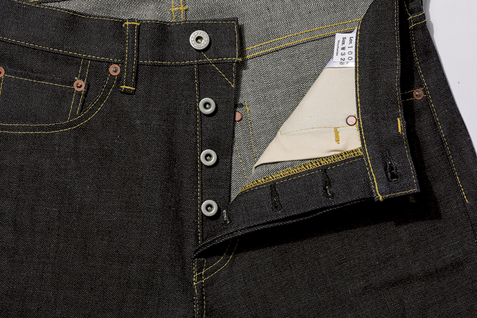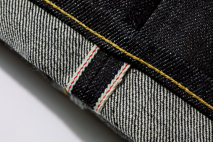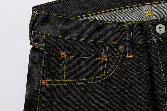 経糸に6・7・8番、緯糸に7番のムラ糸を仕様したオリジナルの13.5オンスデニム。戦後の1940〜’50年代のスタイルをイメージした、オーソドックスなワイドシルエットだが、経糸に異なる番手を採用することで、履き込んだ先に表情豊かな独特の縦落ちを生み出す。