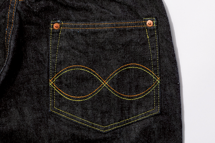 DNA(二重螺旋図)をイメージした飾りステッチは旧き良きものを引き継ぐというコンセプトを表現する。