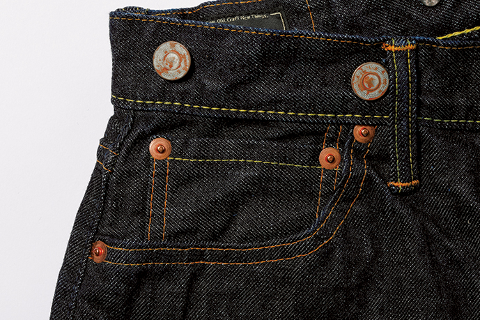 ベルトループに加え、サビ加工が施されたサスペンダーボタンを採用。