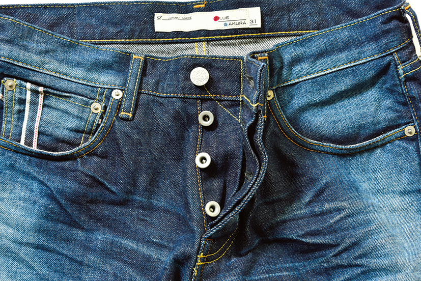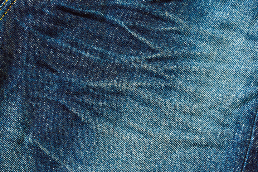 15oz のオリジナルセルビッチ生地に立体的なシワ加工が施されていることで、最初から豊かな表情と穿きジワが見られる。