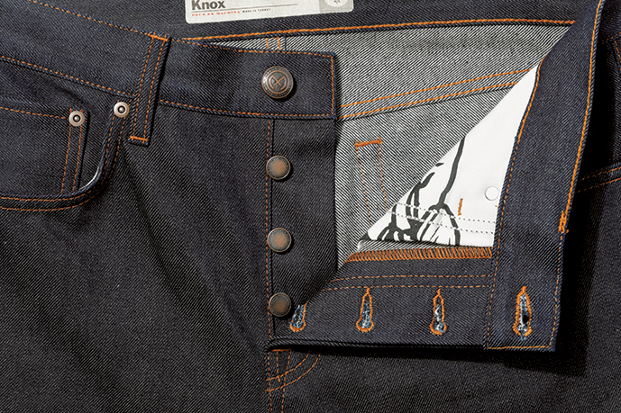 シンプルだが穿き込むごとに縮んで色合いも変化する牛革パッチ。