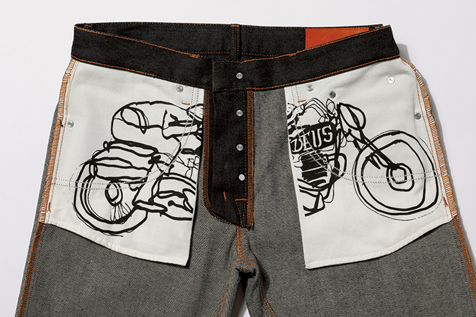 ポケットの袋布にはバイクをあしらうなど、見えないところにもデウスらしい遊び心を効かせるあたりニクイ演出。