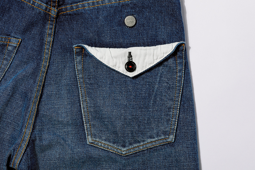 ヒップポケットは右側のみボタン付きのフラップを備えた遊びある仕上げ。