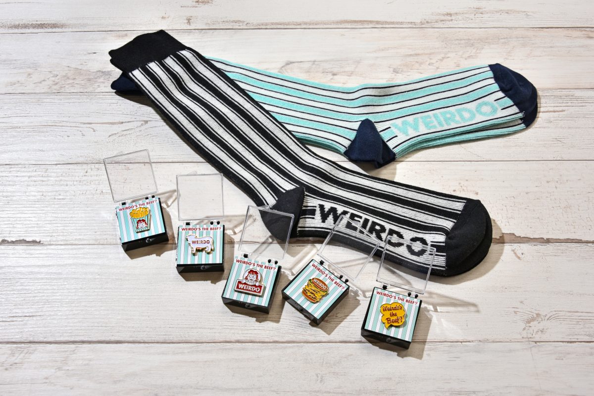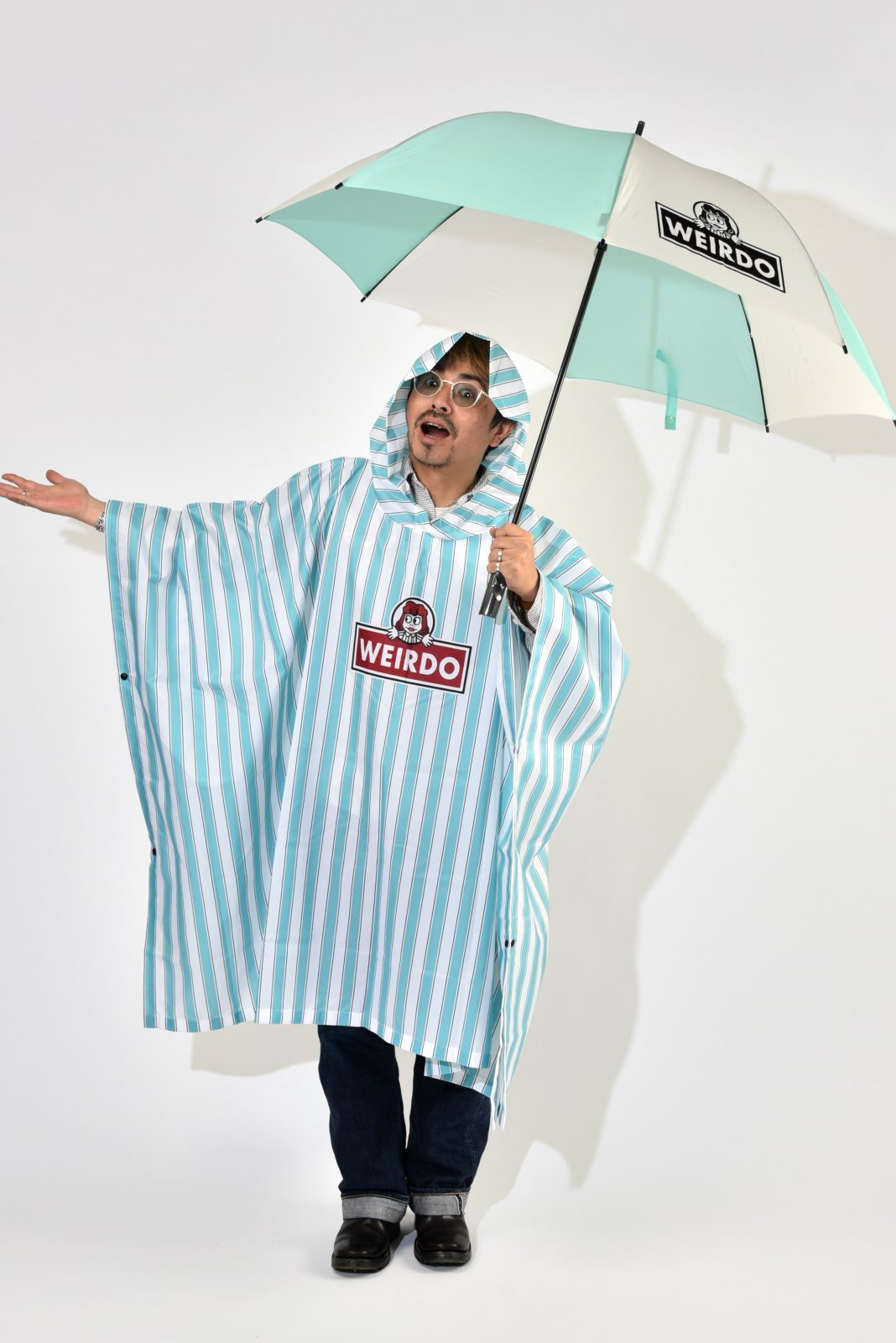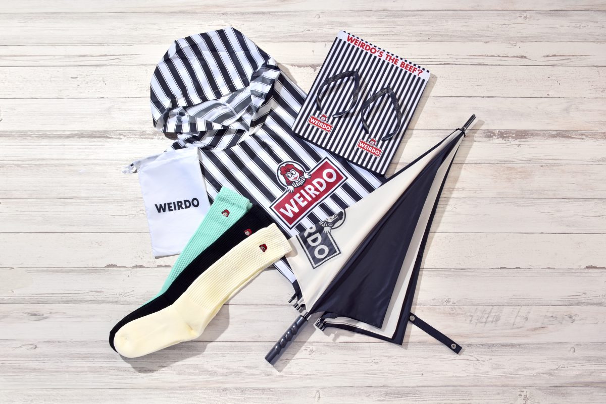 実にポップなデザインの傘にポンチョ、それにビーチサンダルなどなど。旧きよきアメリカのファストフード店を思わせるようなデザインに、独自のキャラクター、ウィンディがあしらわれたグッズたちに目が奪われる。ウィアードのアイテムは昔ながらのアメリカンカルチャーをベースにしながらも、しっかりと遊び心のあるポップで、ときにハメを外した(失礼)デザインが特徴。