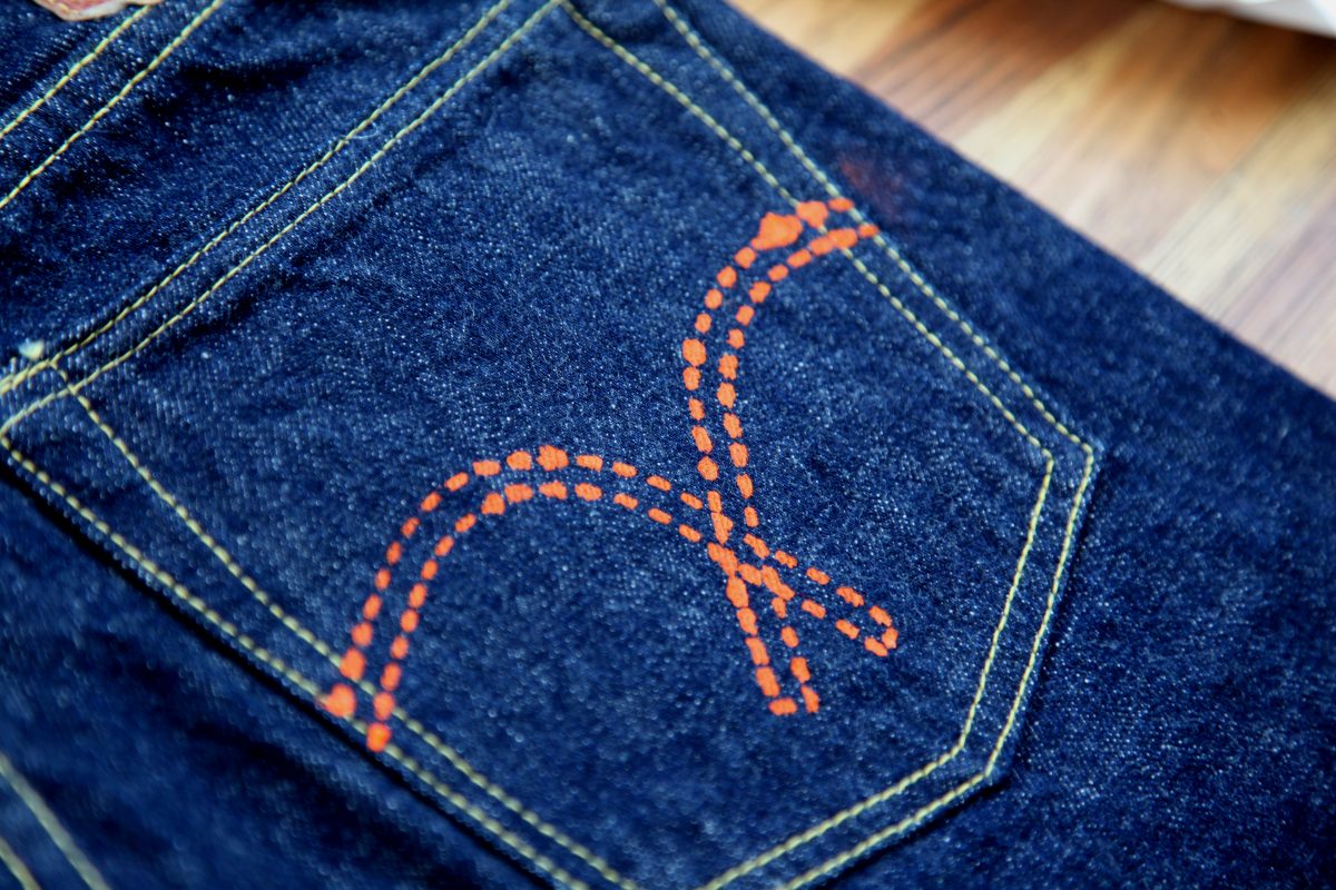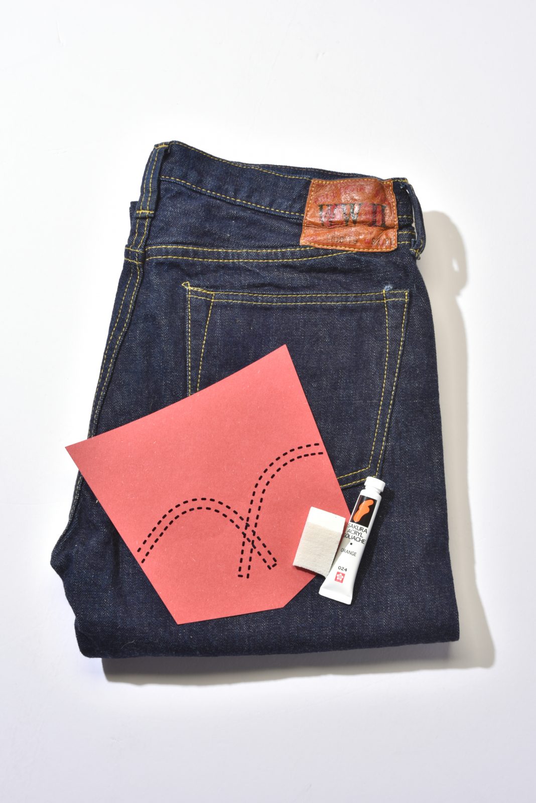 なんとデニムにステンシルシートとアクリル絵の具、スポンジが同梱され、お尻のペンキステッチを自分で入れられるというものなのだ。こんな遊び心に溢れたデニム、見たことある? 目の前で辻田さんが実演をしてくれたのだが、見れば見るほど自分でやりたくなる。これなら不器用な俺でも上手く出来そう。もちろん、ステッチはケツポケではなく、どこに入れたってOK。同梱の絵の具はオレンジだが、色で遊んでも楽しそうだ。