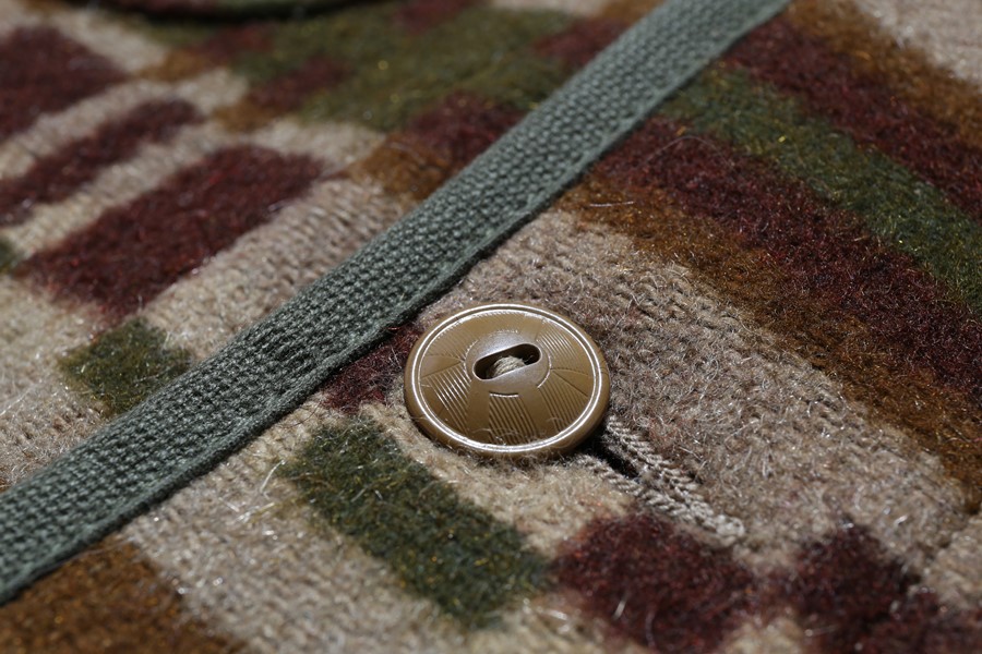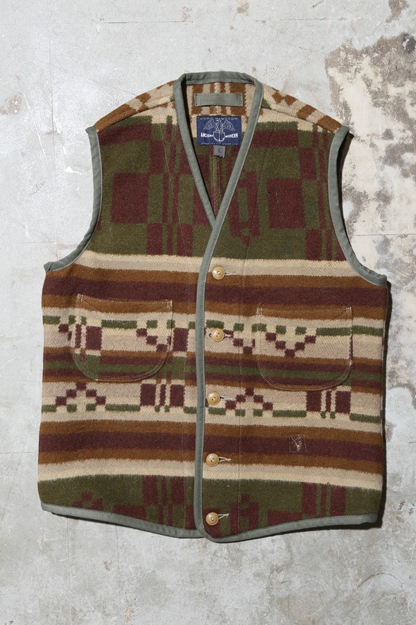 そんな出会い感がお手軽に楽しめ、ヴィンテージ・マテリアルの風合いを味わえるのが、「ジョン・グラッコー」のブランド5周年を記念してリリースされるベストである。これはアメリカ東海岸を拠点に活動するヴィンテージ・ディーラーのジョン・グラッコー氏のコレクションから作られたもので、様々な時代と用途に使われたブランケットからベストの型を切り出している。そのため同じ生地のモデルはあっても柄の配置が違うなど、基本的にすべて一点モノ。多くのバリエーションの中でも、個人的に惹かれたのが、もともと馬車を引く馬の防寒着として、身体をすっぽりと包むブランケットがベースになっているモデル。