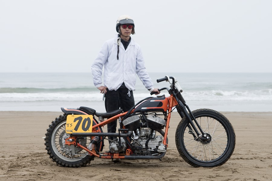 ハーレーのワークスカラーでペイントされた大阪のSHIX製作のフラットヘッドボバー。一見オールドスクールなシルエットだが、分割のスポーツスタータンクや上下逆に装着したダンパーなど、個性的なディテールがこのマシンの見どころ。
