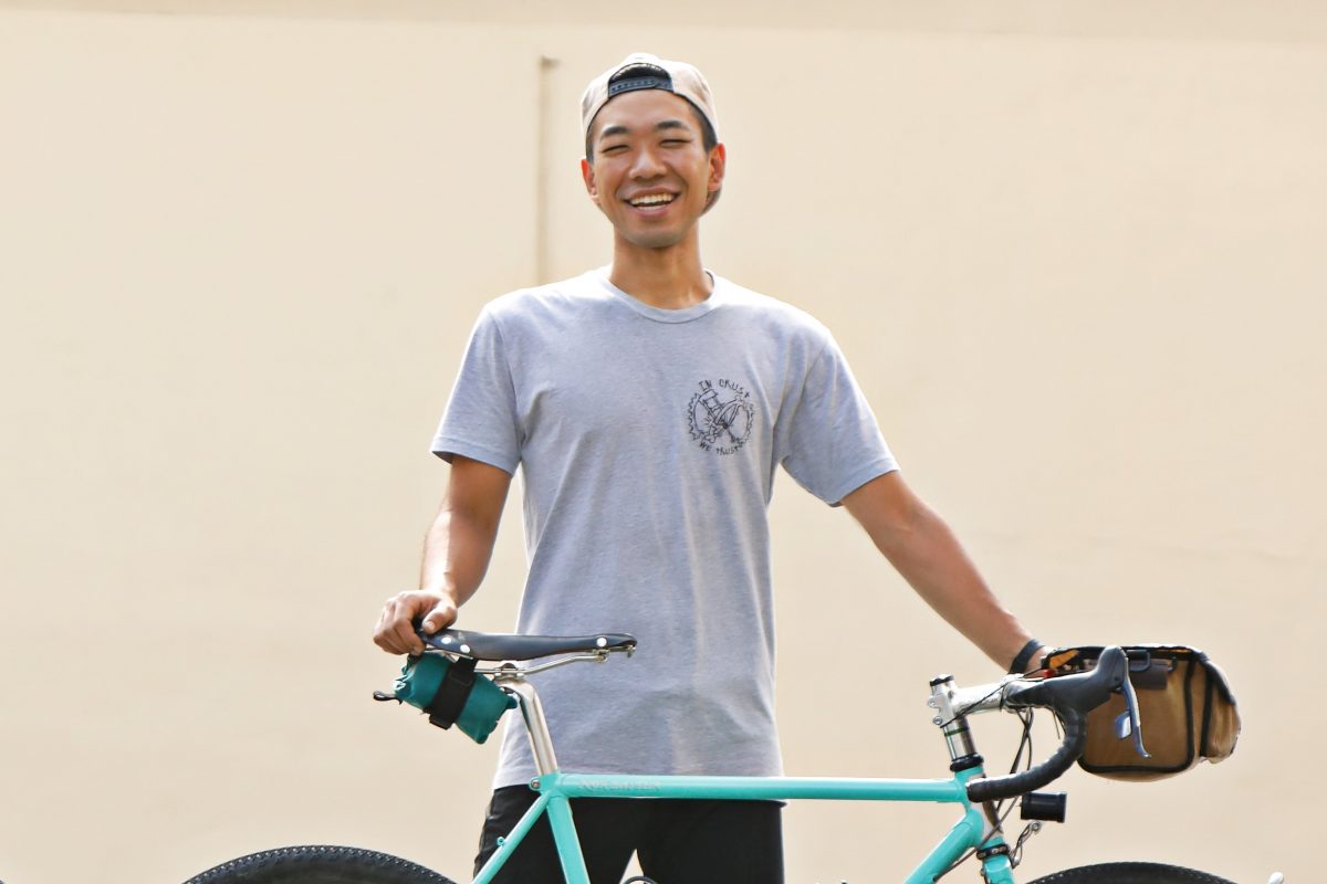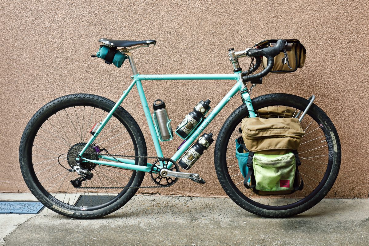 松尾さんの愛車はアメリカを拠点とするマット・ホワイトヘッドのブランド。クラシカルなヘッドバッヂ、ラグ溶接、シートチューブのポンプ台座など、伝統的なランドナースタイルに、ディスクブレーキなど現代的な要素を織り込んだ、悪路も難なく走れる現代的なランドナーだ。