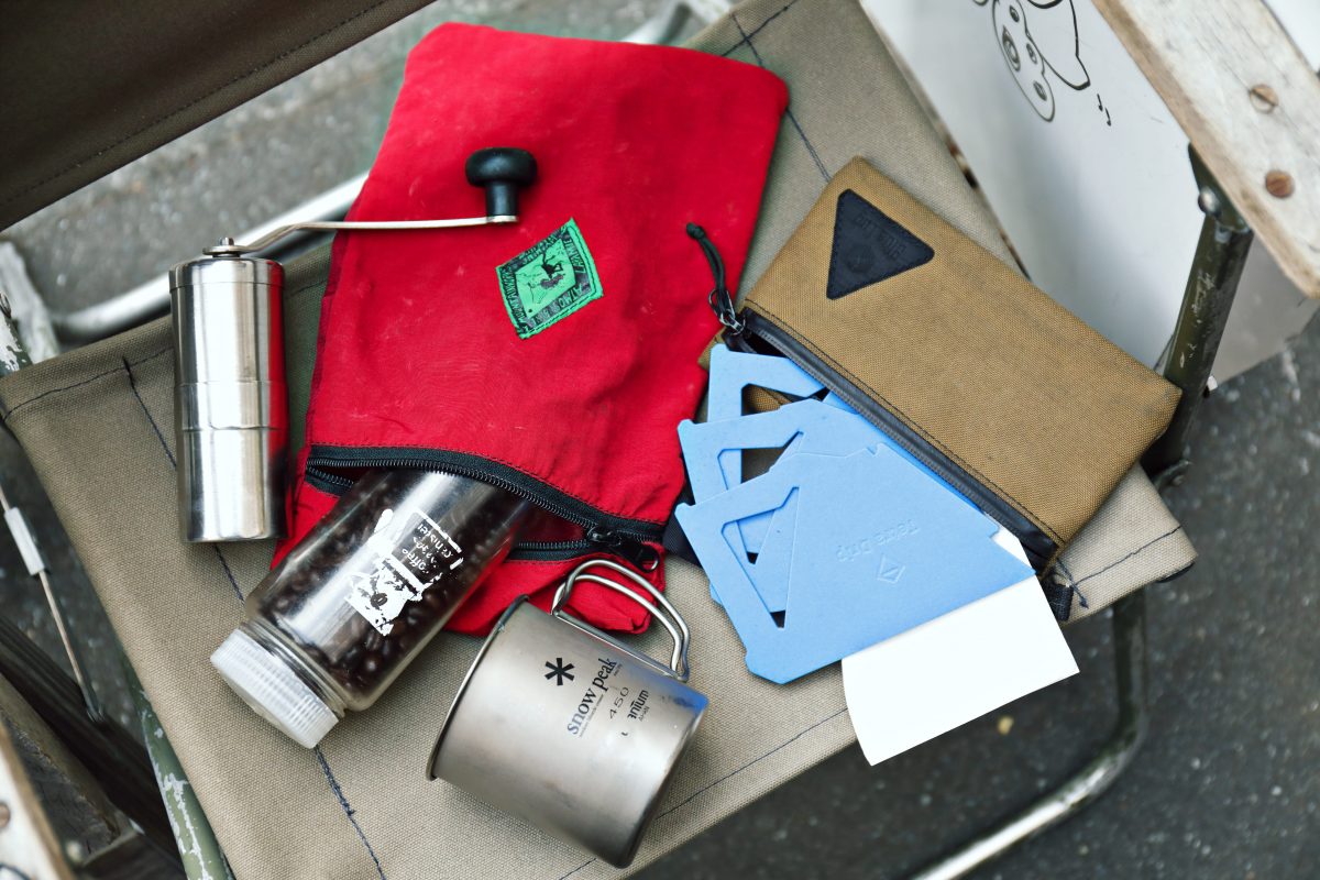 松尾さんもコーヒーが好きなので、コンパクトなのが魅力のポーレックスのミルは必ず持っていく。シェラカップは地元が新潟ということもあり、スノーピークのものを愛用(すべて私物)。